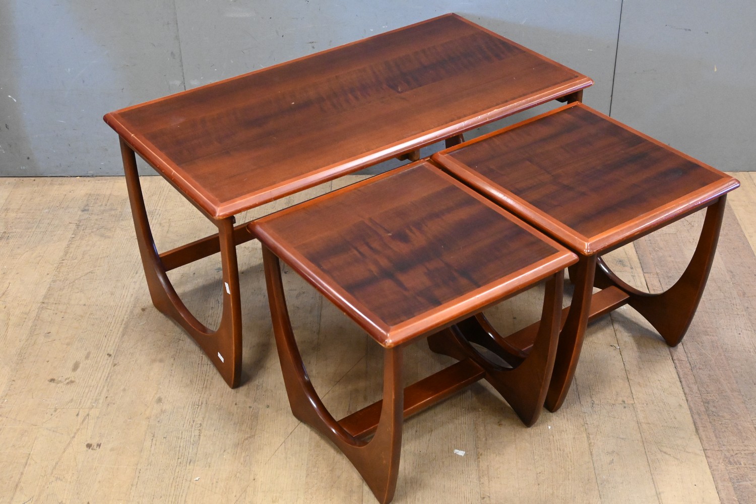 A NEST OF THREE RETRO MID CENTURY RECTANGULAR KALMAR COFFEE AND SIDE TABLES (H47 X W93 X D50 CM) (LEONARD JOEL DELIVERY SIZE: LARGE)