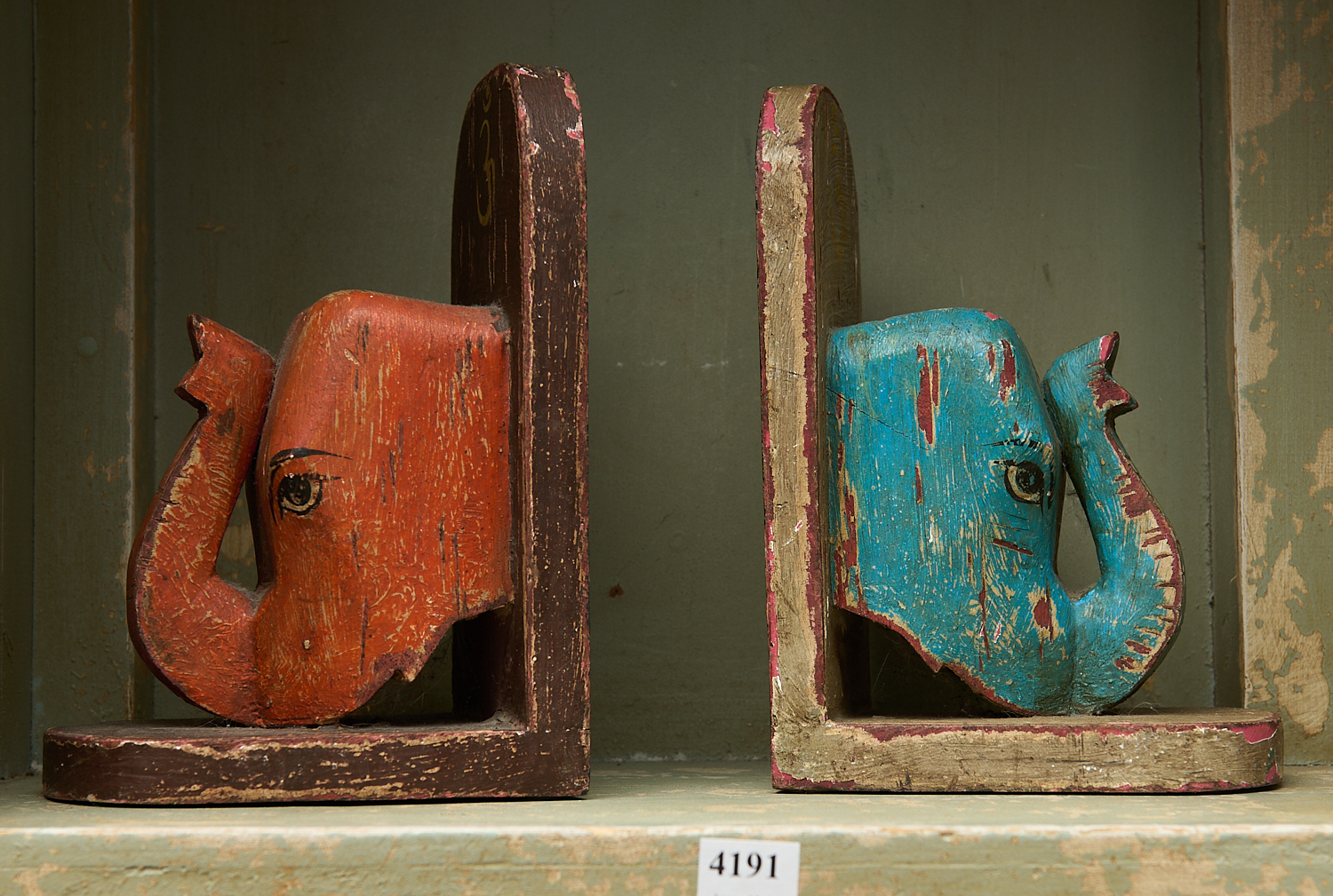 A PAIR OF CARVED AND PAINTED WOODEN ELEPHANT BOOKENDS H.22CM, LEONARD JOEL LOCAL DELIVERY SIZE: SMALL