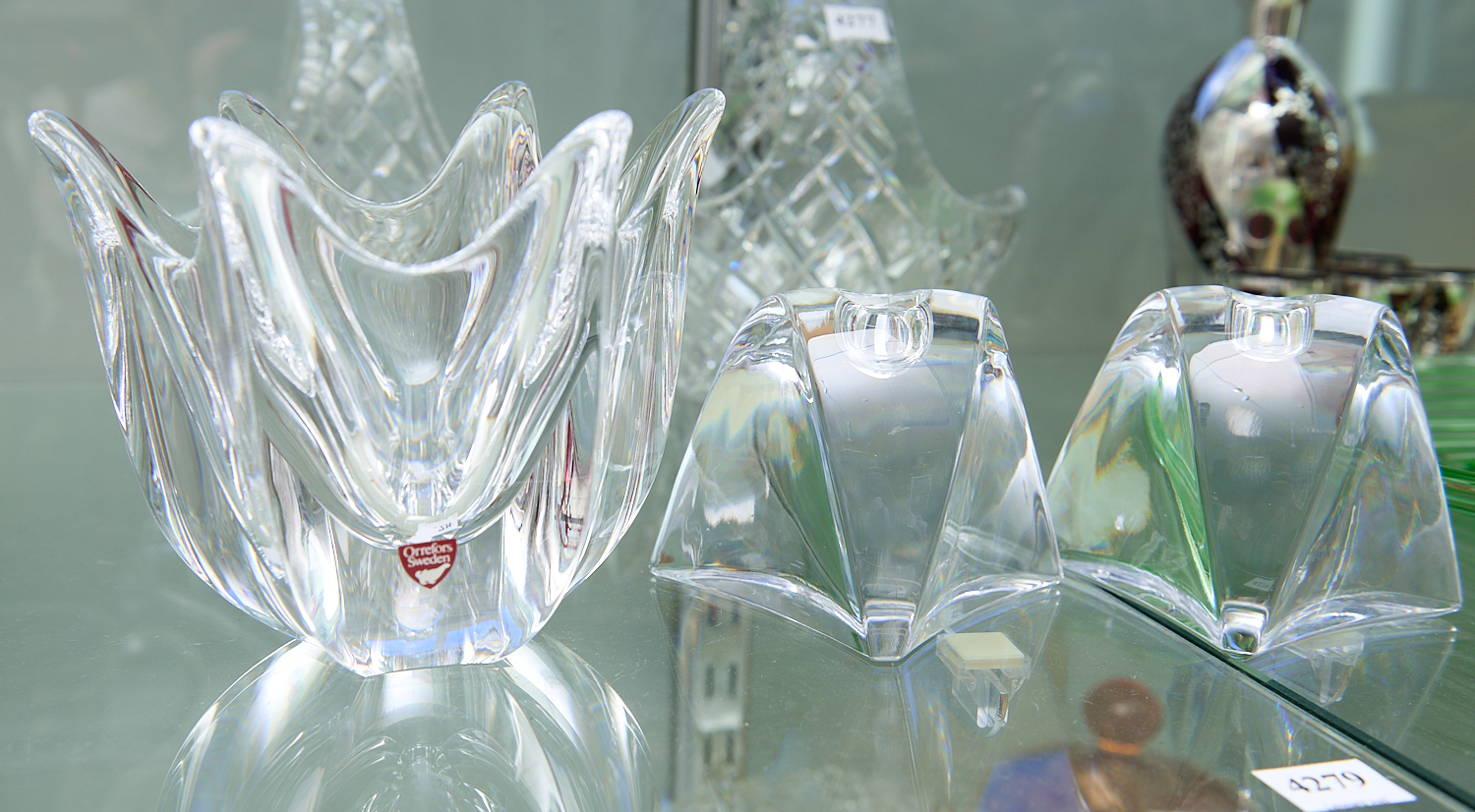 A GROUP OF THREE ORREFORS CLEAR GLASS ITEMS INCLUDING BOWL AND CANDLESTICKS H.13CM (TALLEST), LEONARD JOEL LOCAL DELIVERY SIZE: MEDIUM