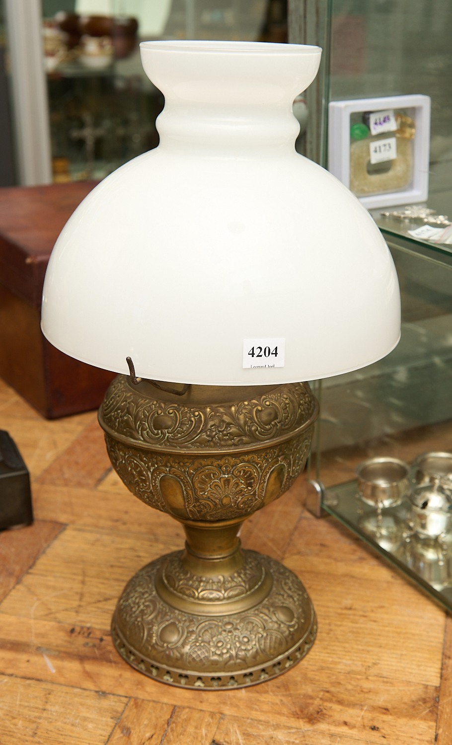 A BRASS KEROSENE LAMP WITH MILK GLASS SHADE H.44CM, LEONARD JOEL LOCAL DELIVERY SIZE: MEDIUM