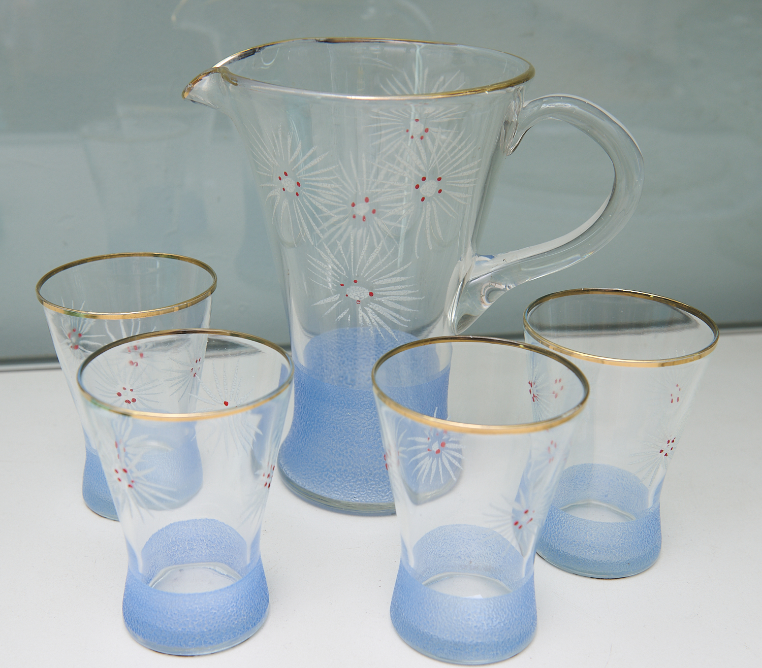 AN ENAMEL DECORATED LEMONADE JUG AND FOUR MATCHED TUMBLERS, LEONARD JOEL LOCAL DELIVERY SIZE: MEDIUM
