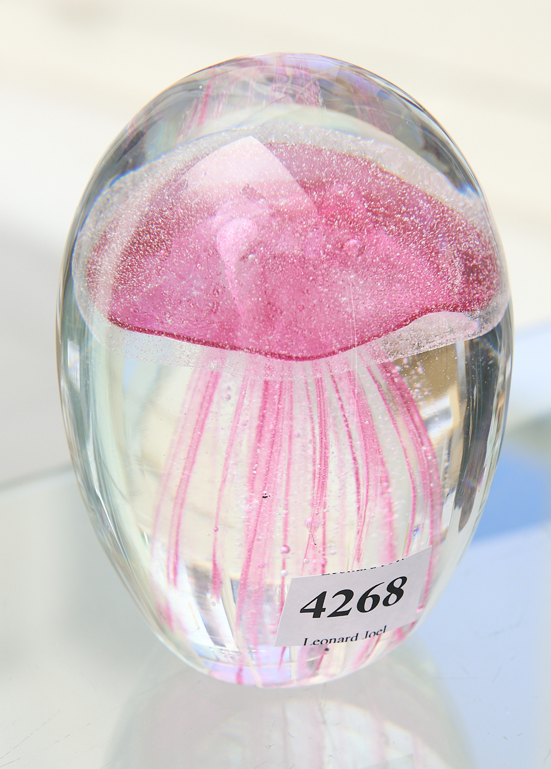 A RETRO GLASS PAPERWEIGHT WITH INTERNAL SUSPENDED JELLY FISH H.10CM, LEONARD JOEL LOCAL DELIVERY SIZE: SMALL