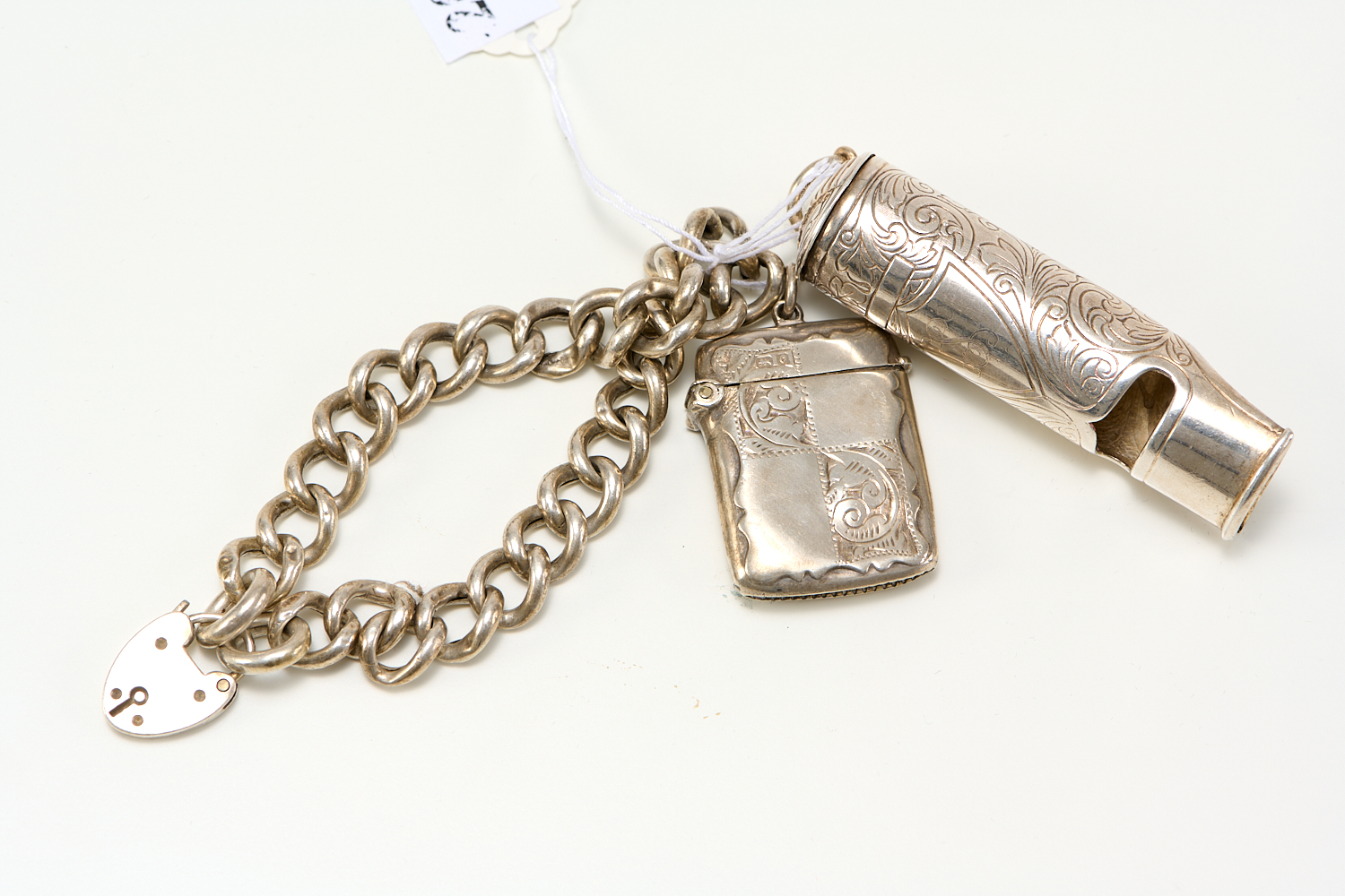 A COLLECTION OF STERLING SILVER FINDINGS, INCLUDING AN ANTIQUE WHISTLE, A PADLOCK CHAIN LINK BRACELET AND A MATCH BOX FEATURING HALLMARKS INCLUDING DATE LETTER 'C'