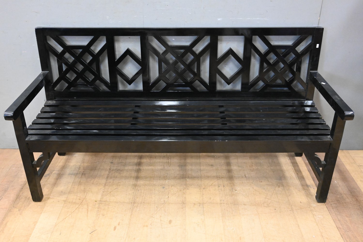 A TEAK BENCH SEAT IN BLACK 2 PAK FINISH (94H x 180W x 65D CM) (PLEASE NOTE THIS HEAVY ITEM MUST BE REMOVED BY CARRIERS AT THE CUSTOMER'S EXPENSE. LEONARD JOEL STAFF CANNOT ASSIST CARRYING THIS ITEM) (X-LARGE ITEM)