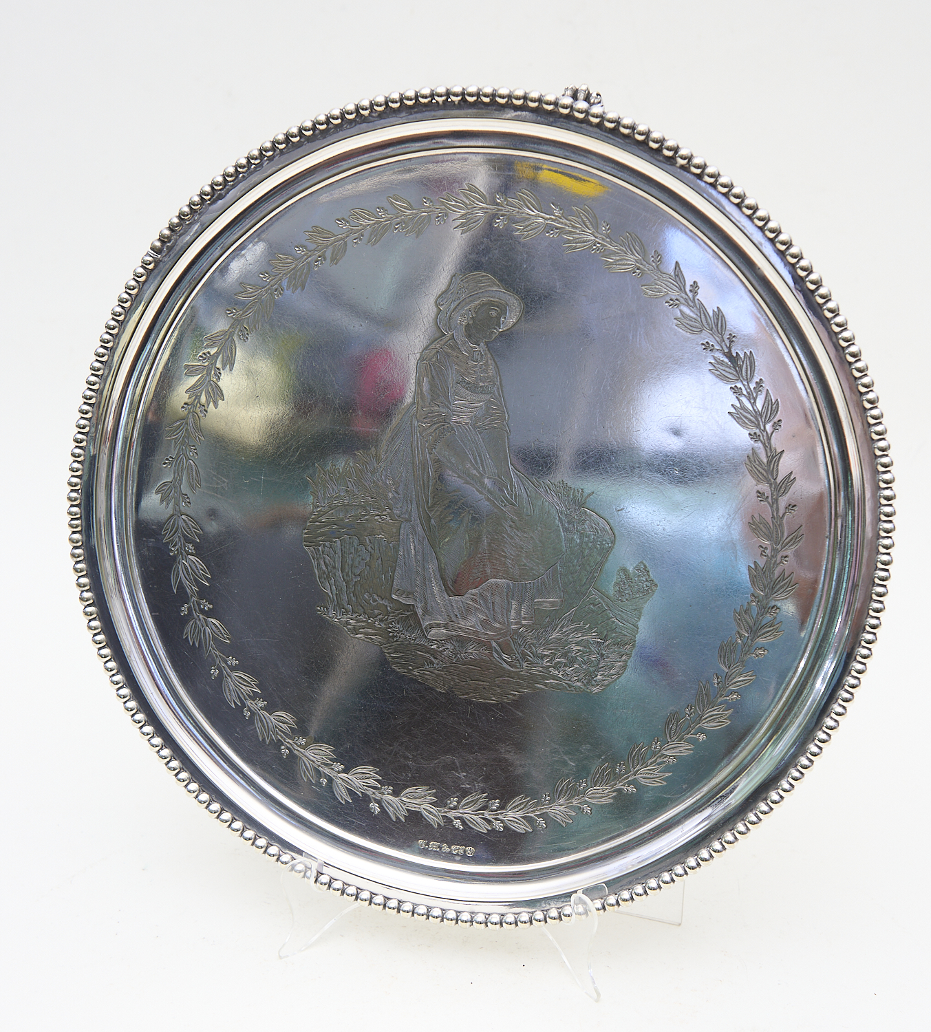 A 19TH CENTURY SILVERPLATED ENGRAVED FIGURAL TRIFOOT SALVER DIA.35CM, LEONARD JOEL LOCAL DELIVERY SIZE: MEDIUM