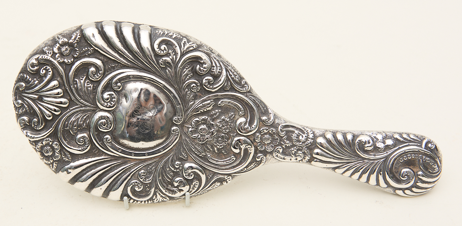 HEAVILY EMBOSSED ENGLISH STERLING SILVER DRESSING TABLE HAND MIRROR L.26.5CM, LEONARD JOEL LOCAL DELIVERY SIZE: SMALL