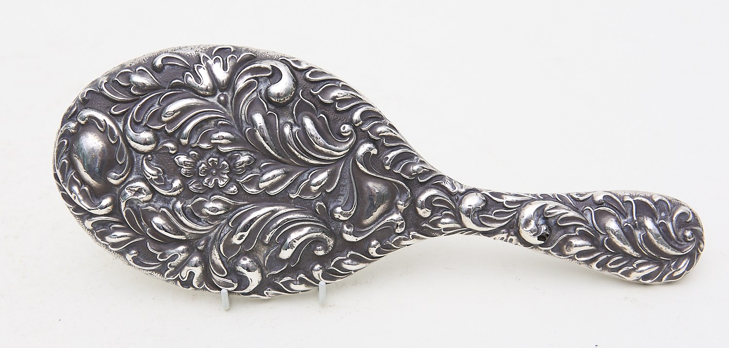 HEAVILY EMBOSSED ENGLISH STERLING SILVER DRESSING TABLE HAND MIRROR L.26CM, LEONARD JOEL LOCAL DELIVERY SIZE: SMALL