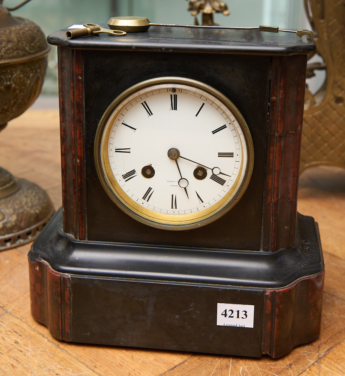 A 19TH CENTURY RED MARBLE AND SLATE MANTLE CLOCK WITH KEY AND PENDULUM H.22CM X W.22.5CM, LEONARD JOEL LOCAL DELIVERY SIZE: MEDIUM