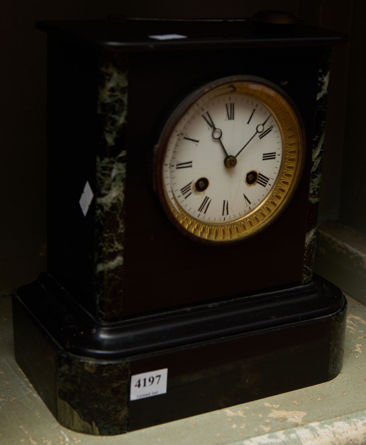 A 19TH CENTURY VERDE MARBLE AND SLATE MANTLE CLOCK WITH KEY AND PENDULUM H.24CM X W.22.5CM, LEONARD JOEL LOCAL DELIVERY SIZE: MEDIUM