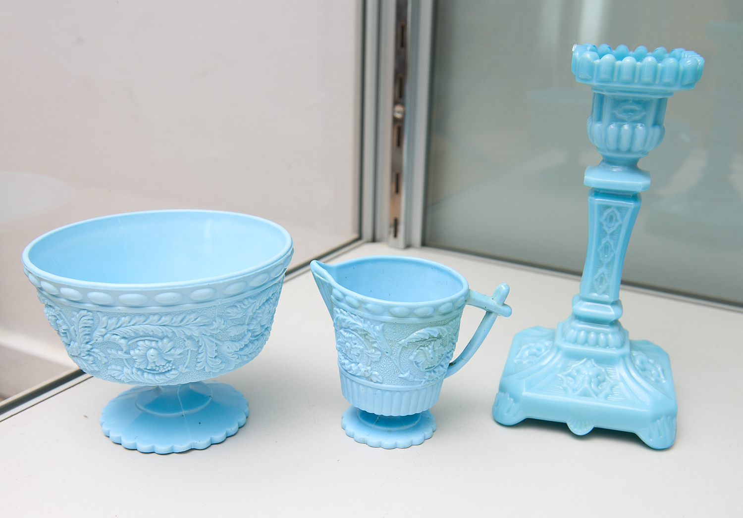 A GROUP OF THREE BLUE OPALINE GLASS ITEMS INCLUDING CANDLESTICK JUG AND BOWL H.20CM (TALLEST), LEONARD JOEL LOCAL DELIVERY SIZE: SMALL