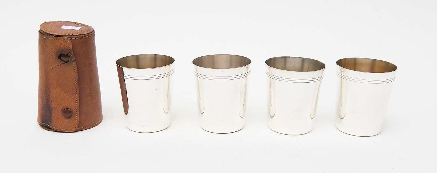 1920S ENGLISH LEATHER CASED TRAVELLING SILVERPLATED STACKING CUP SET BY P H V & CO H.8.5CM, LEONARD JOEL LOCAL DELIVERY SIZE: SMALL