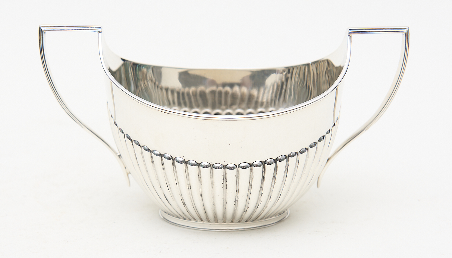 A STERLING SILVER FLUTED TWO HANDLED SUGAR BOWL - 278 GRAMS W.20CM, LEONARD JOEL LOCAL DELIVERY SIZE: SMALL