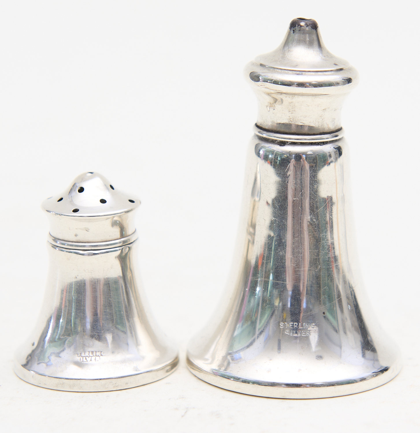 TWO AUSTRALIAN STERLING SILVER ART DECO SALT AND PEPPER SHAKERS - 100 GRAMS H.8CM (TALLEST), LEONARD JOEL LOCAL DELIVERY SIZE: SMALL