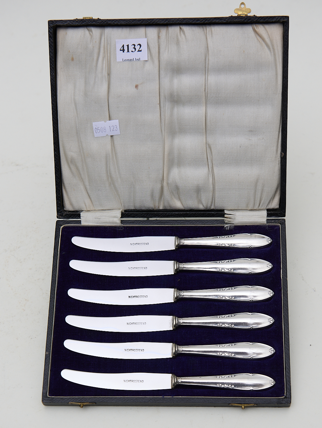 A CASED SET OF SIX 900 SILVER HANDLED PATE KNIVES, LEONARD JOEL LOCAL DELIVERY SIZE: SMALL