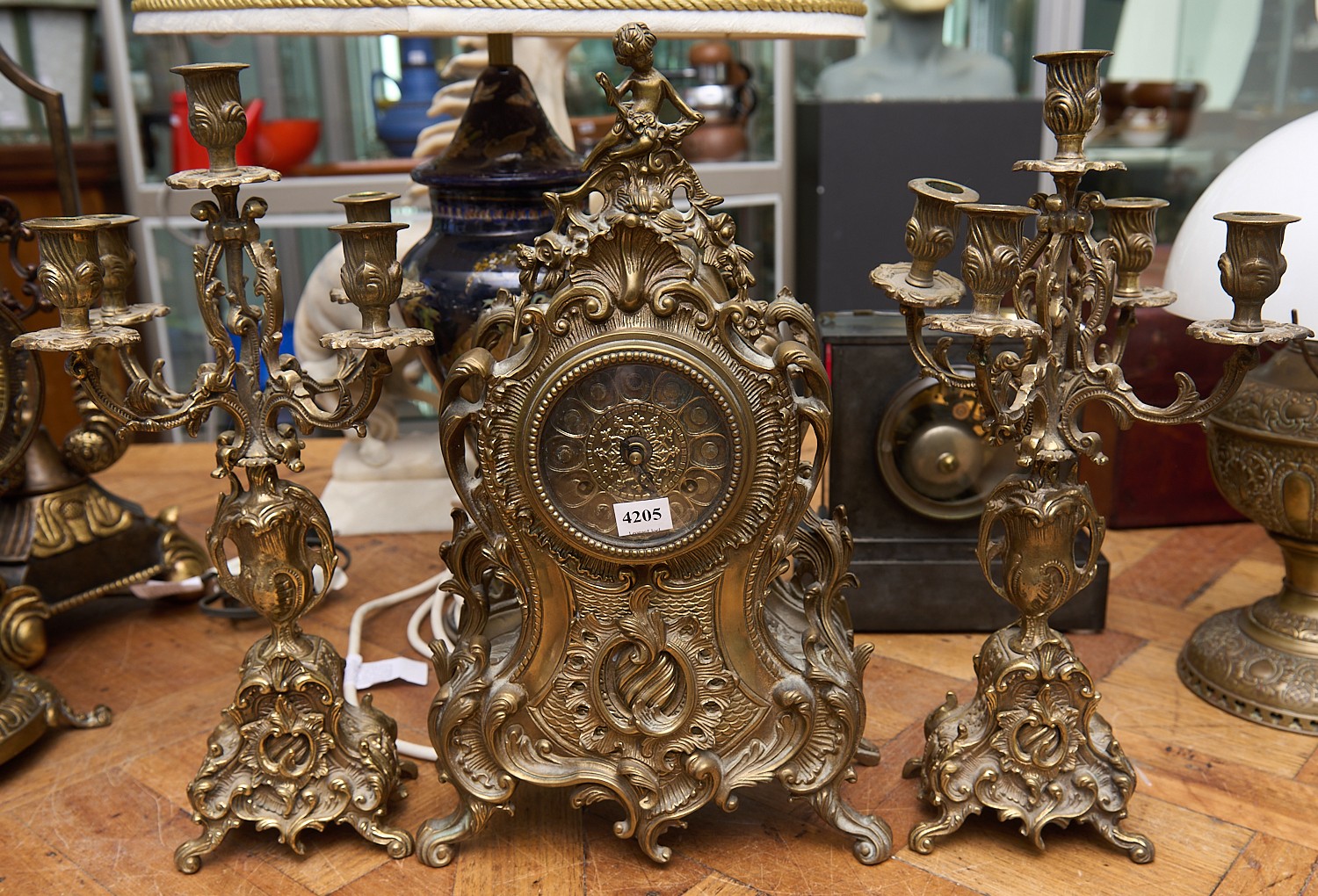 A BRASS CASED CLOCK GARNITURE H.43CM, LEONARD JOEL LOCAL DELIVERY SIZE: MEDIUM