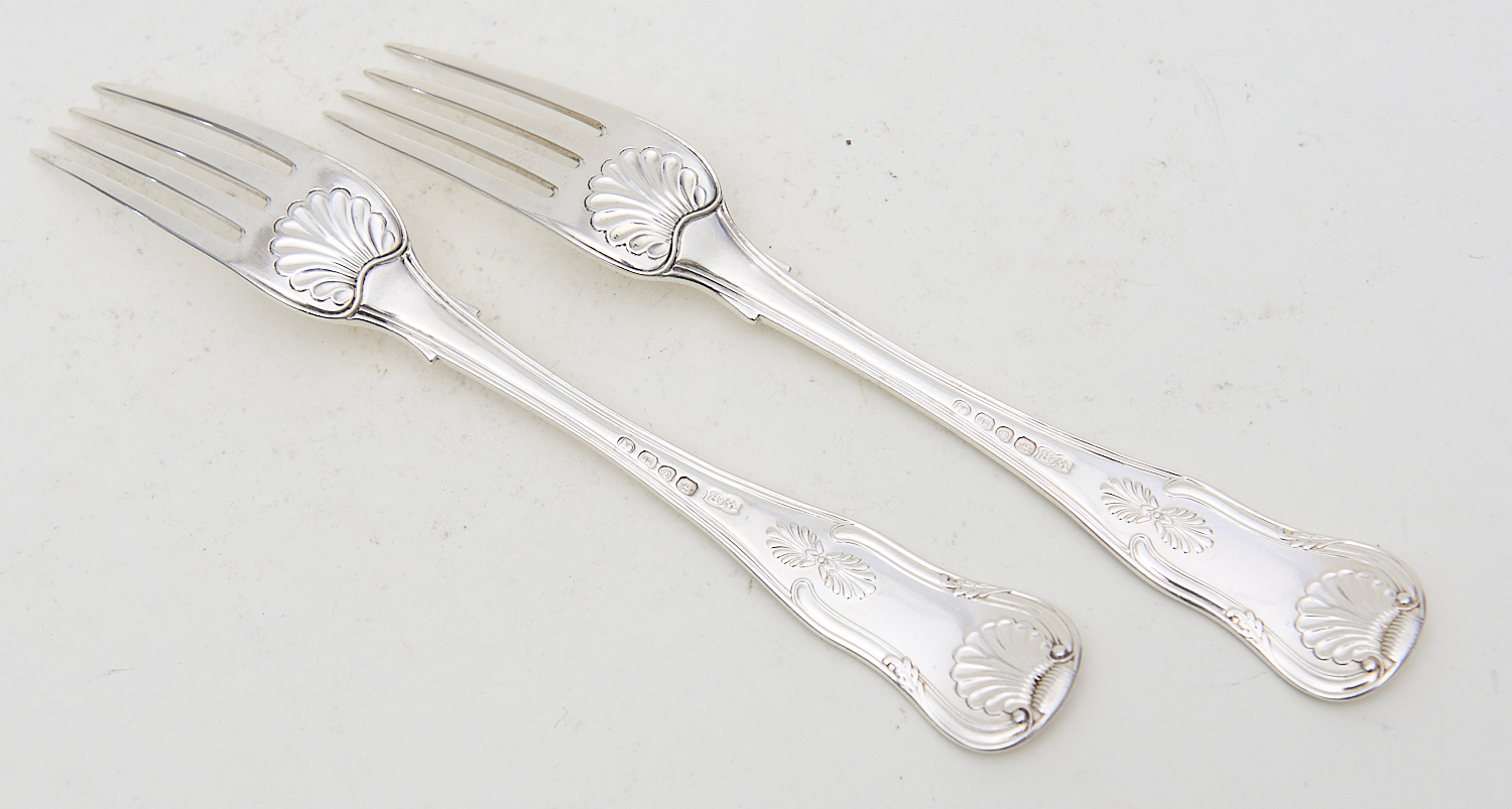 A PAIR OF GEORGIAN STERLING SILVER DINNER FORKS - SHELL & FIDDLE PATTERN WITH WINGED DRAGON CREST L.21CM, LEONARD JOEL LOCAL DELIVERY SIZE: SMALL