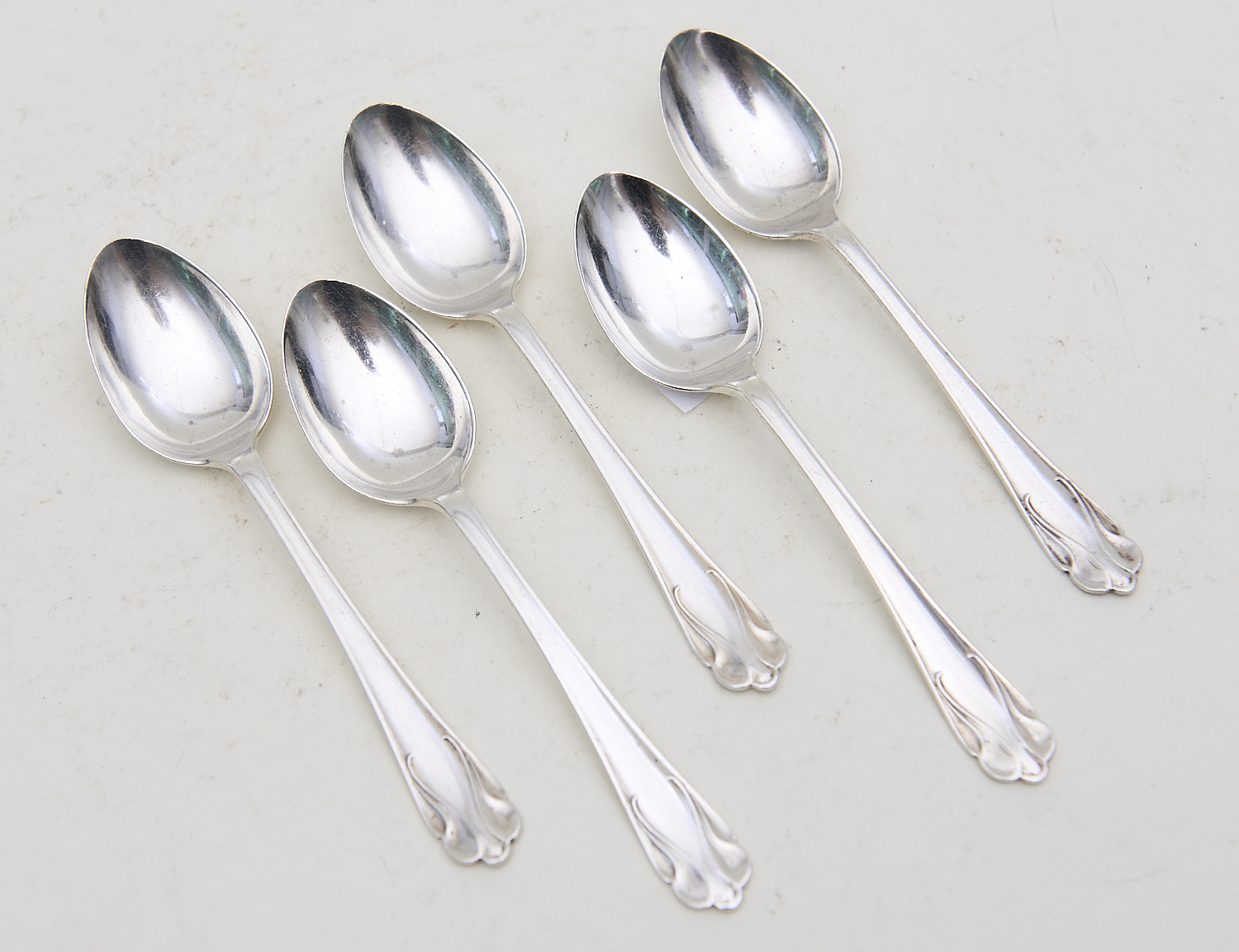 GROUP OF FIVE STERLING SILVER TEASPOONS - 90 GRAMS L.12.5CM, LEONARD JOEL LOCAL DELIVERY SIZE: SMALL
