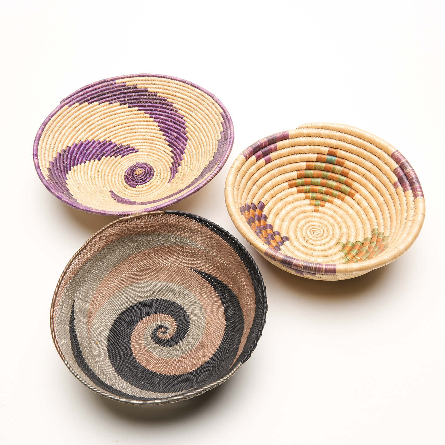 THREE HAND WOVEN BASKET BOWLS DIA.26CM, LEONARD JOEL LOCAL DELIVERY SIZE: MEDIUM