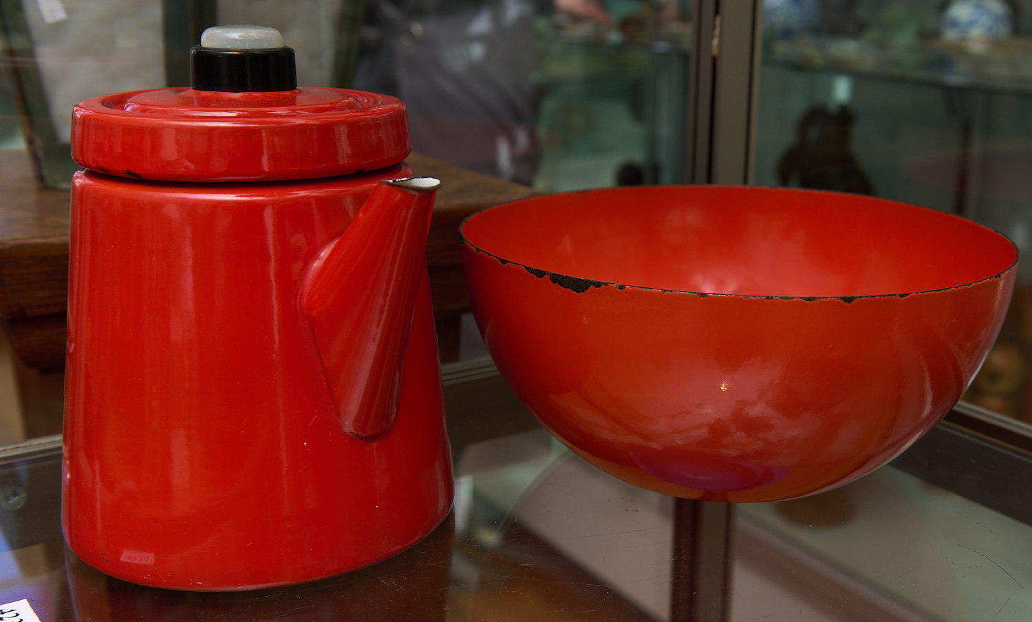 A FINNISH FINEL COFFEE POT AND A SALAD BOWL (A/F LOSSES TO ENAMEL), LEONARD JOEL LOCAL DELIVERY SIZE: MEDIUM