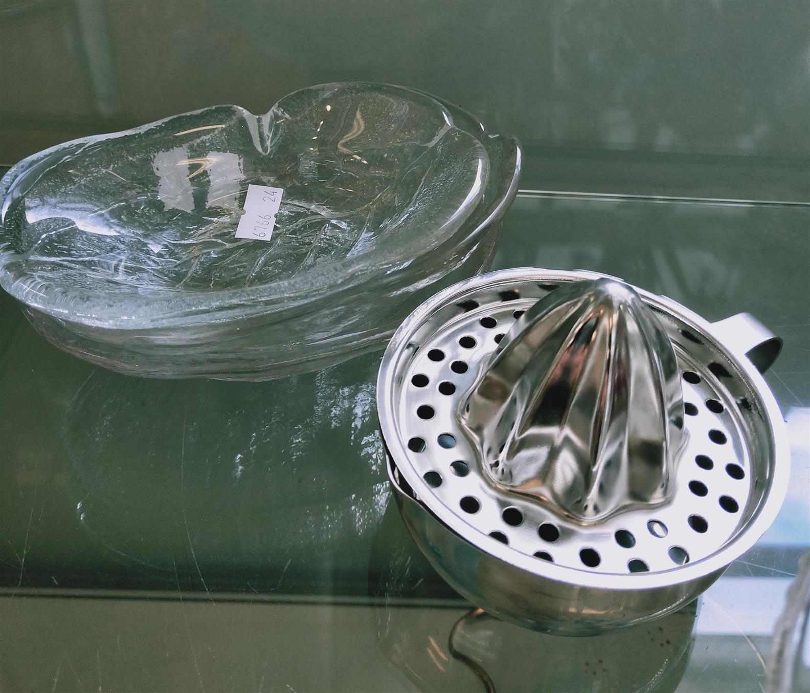 THREE GLASS AVOCADO DISHES TOGETHER WITH A LEMON JUICER, LEONARD JOEL LOCAL DELIVERY SIZE: SMALL