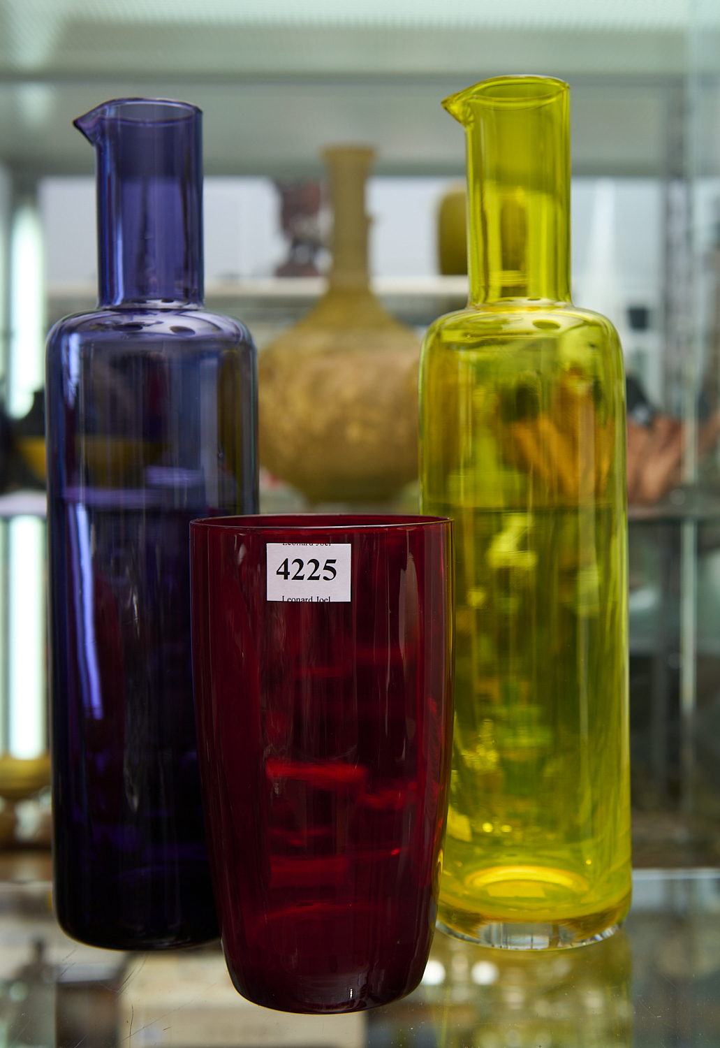 THREE HAND BLOWN COLOURED GLASS VESSELS H.30CM (TALLEST), LEONARD JOEL LOCAL DELIVERY SIZE: MEDIUM