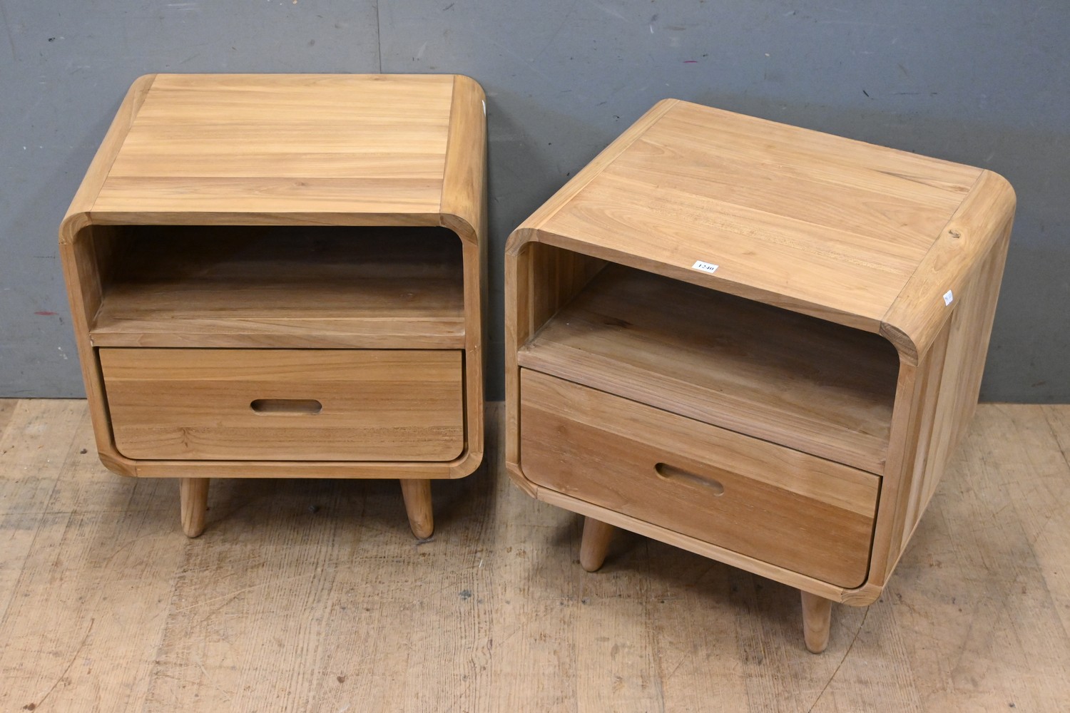A PAIR OF TEAK BEDSIDE TABLES ( 56H X 52W X 40D CM) (LEONARD JOEL DELIVERY SIZE: LARGE)