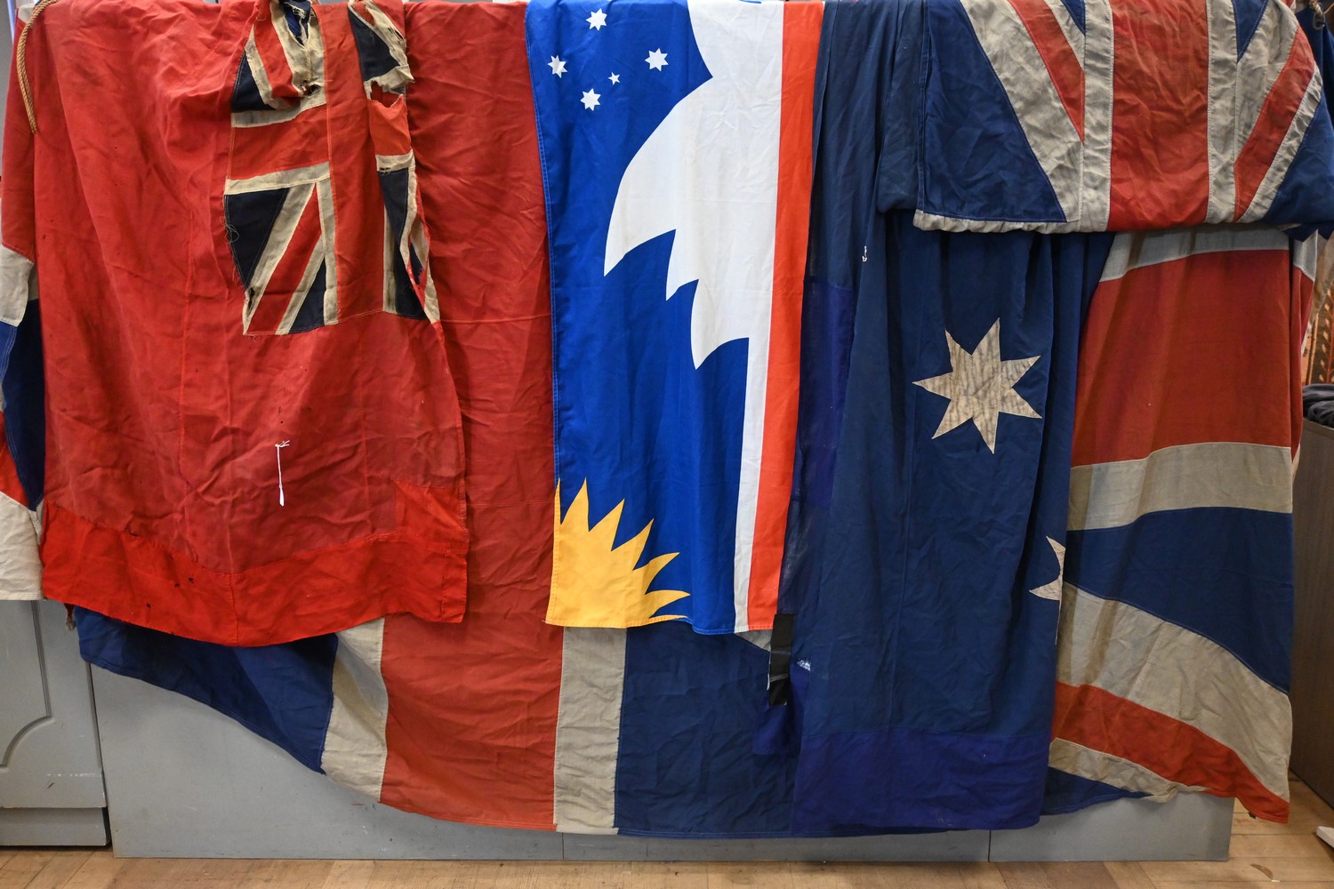 A COLLECTION OF VINTAGE FLAGS, INCLUDING A UNION JACK. AUS FLAG MEASURES 435 X 210 CM (LEONARD JOEL DELIVERY SIZE: LARGE)