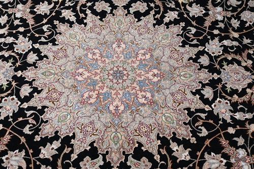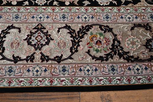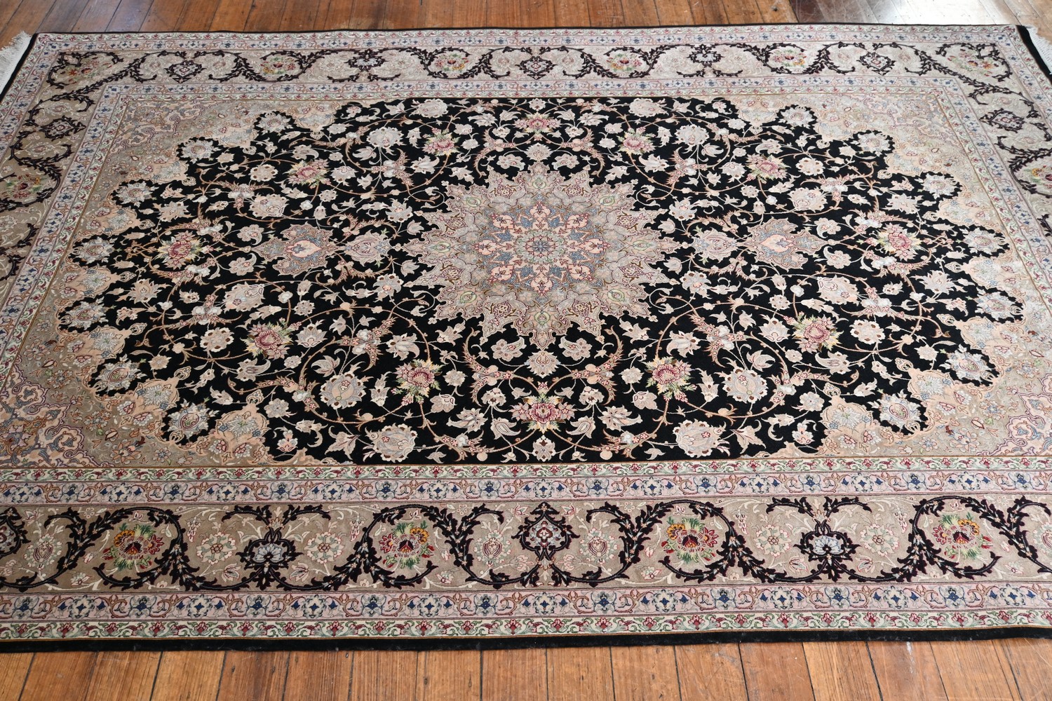 THE UTMOST BEAUTY AND ELEGANCE OF THE PERSIAN ISFAHAN SILK AND KORK WOOL CARPET. EXTREMELY FINELY HAND KNOTTED WITH APPROXIMATE 700,000 INDIVIDUAL KNOTS PSQ, COMPRISING OF IN EXCESS OF 60% PERSIAN CASPIAN SILK AND FINEST KORK WOOL IN TONES OF ONYX BLACK FIELD, GOLD, SILVER, CHAMPAGNE, CARAMEL TONE SILK WITH HIGHLIGHTS OF CRIMSON & GREEN ROSETTE, FEATURING AN EXQUISITE 16 LOBED STAR MEDALLION. THE WEAVE AND DESIGN IS SUPERBLY EXECUTED BY THE MASTER WEAVING STUDIO OF DAVARI SIGNED AND INSCRIBED. ISFAHAN RUGS ARE VERY HIGHLY RATED FOR THEIR INVESTMENT AS WELL AS RESALE VALUES, ORIGIN CENTRAL PERSIA. Size: 304cm x 199cm RRP $59,000
