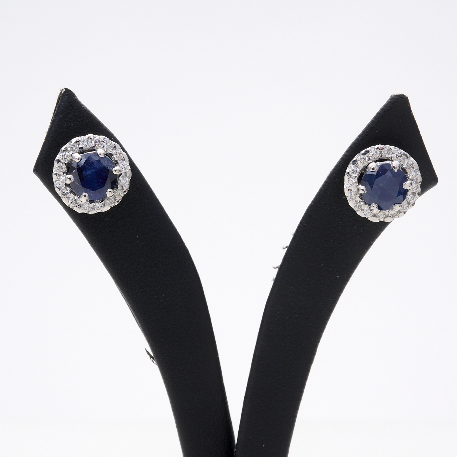 A PAIR OF CONVERTIBLE SAPPHIRE AND DIAMOND CLUSTER EARRINGS IN 18CT WHITE GOLD, TO POST AND BUTTERFLY FITTINGS, THE SAPPHIRES WEIGHING 2.36CTS, THE DIAMONDS WEIGHING 0.30CTS