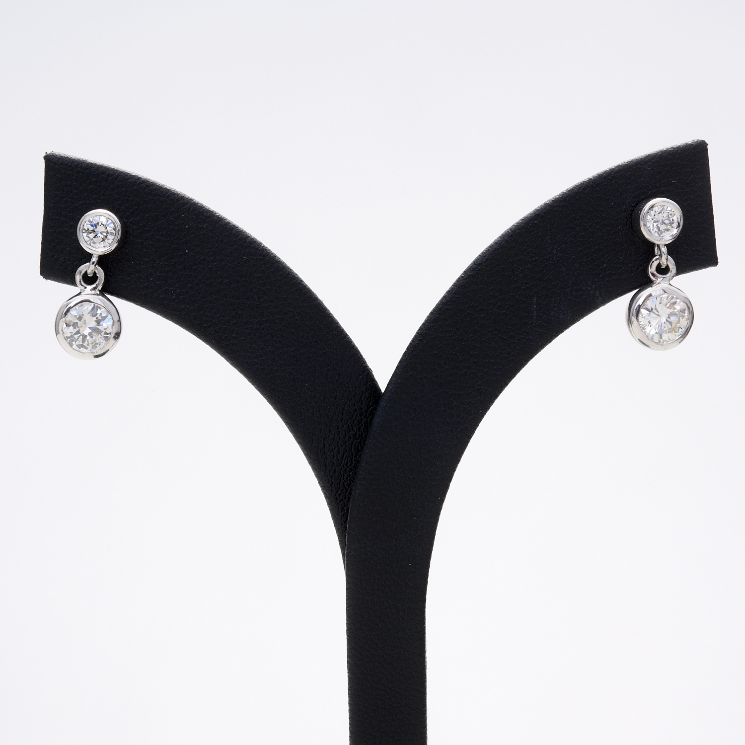 A PAIR OF DIAMOND SET EARRINGS IN 18CT WHITE GOLD TO STUD FITTINGS WITH DIAMOND DROPS, THE DIAMONDS WEIGHING 1.04CTS AND 0.38CTS, IN TOTAL 1.42CTS