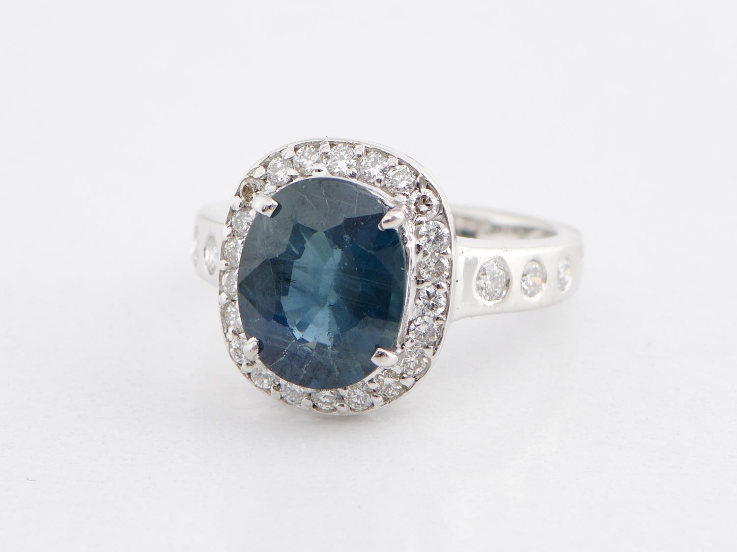 A SAPPHIRE AND DIAMOND SET RING IN 18CT WHITE GOLD, THE GREENISH BLUE SAPPHIRE WEIGHING 4.25CTS, THE DIAMONDS TOTALLING 0.60CTS, RING SIZE M 1/2, WEIGHT 5.4GMS