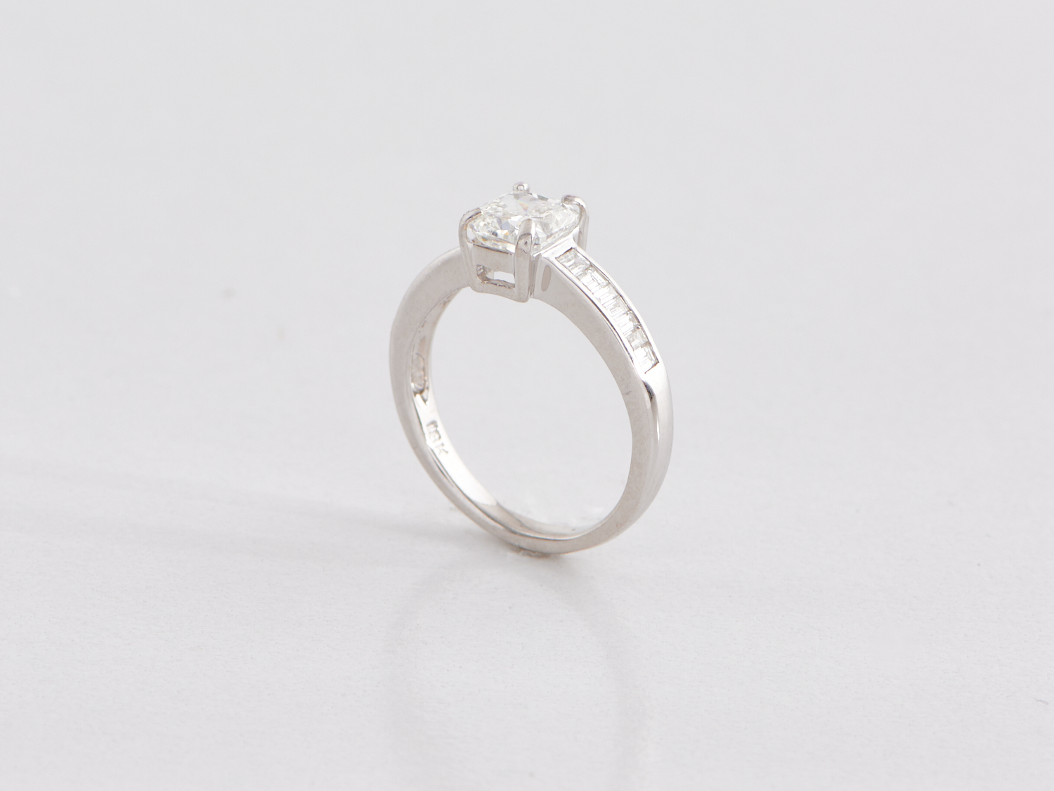 A DIAMOND SET RING IN 18CT WHITE GOLD, CENTRING A CLAW-SET ROUND BRILLIANT-CUT DIAMOND WEIGHING 1.22 CARATS, FLANKED BY FURTHER BRIL...