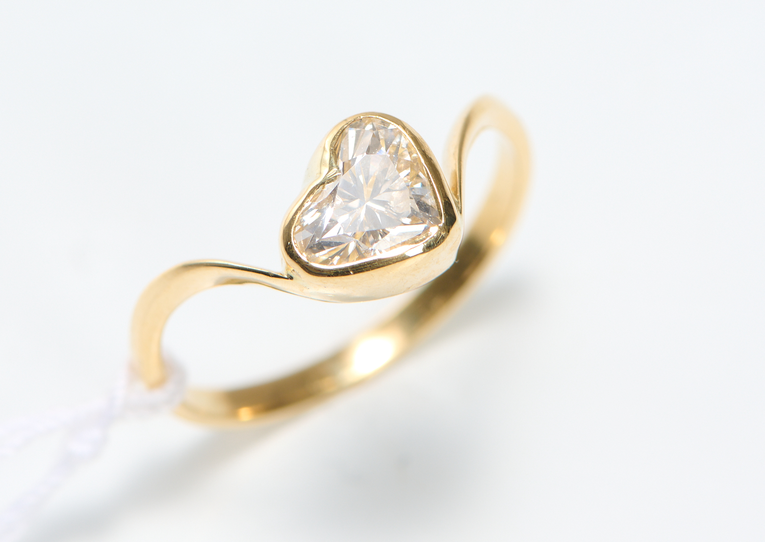 A SYNTHETIC HEART-CUT DIAMOND RING IN 18CT GOLD, SIZE K 1/2, 2.1GMS