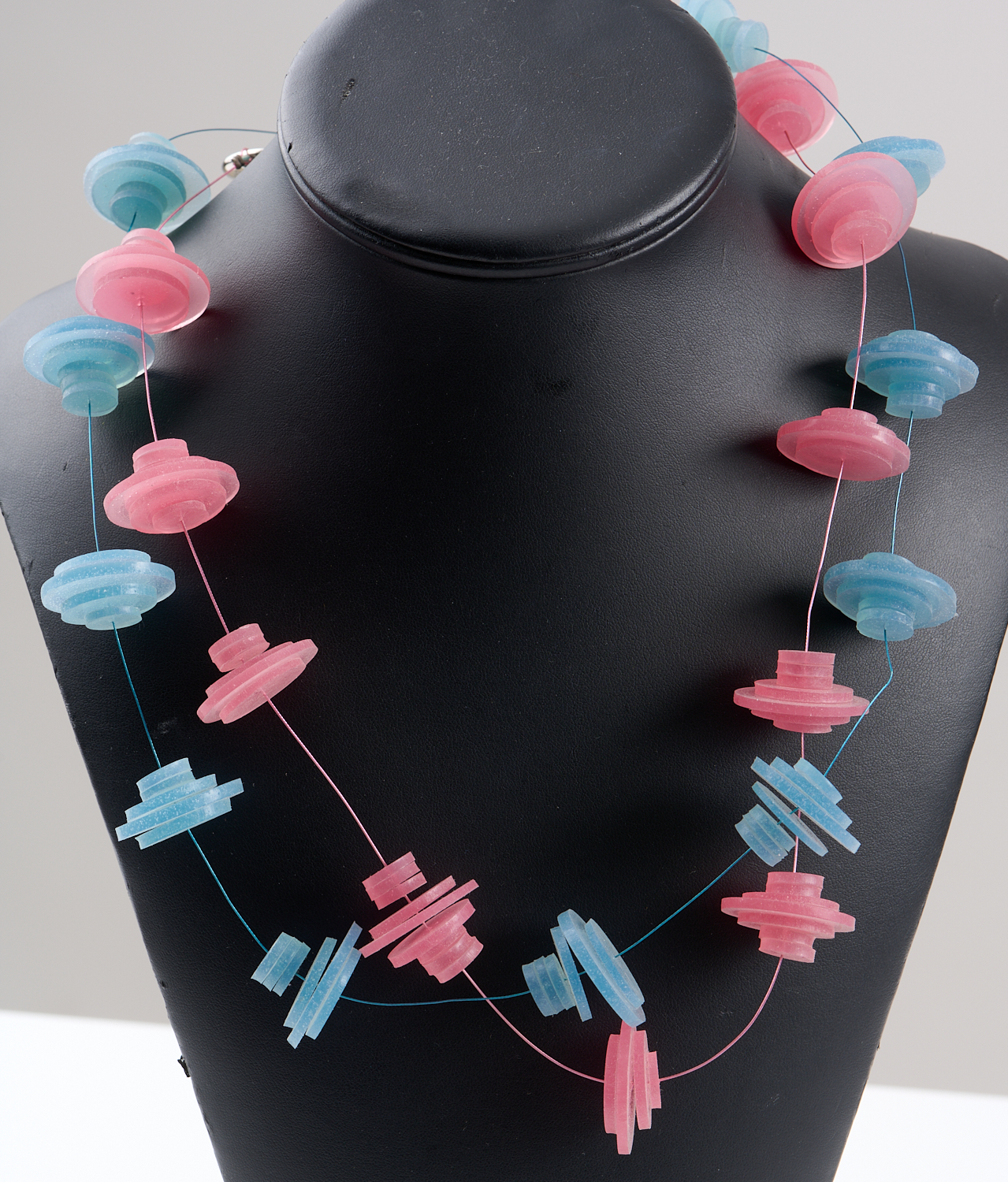 TWO MIXED MEDIA CONTEMPORARY NECKLACES INCLUDING LASER CUT RUBBER DISCS TO METAL CLASPS BY PERFECTOS DRAGONES, LENGTHS APPROXIMATELY 650MM