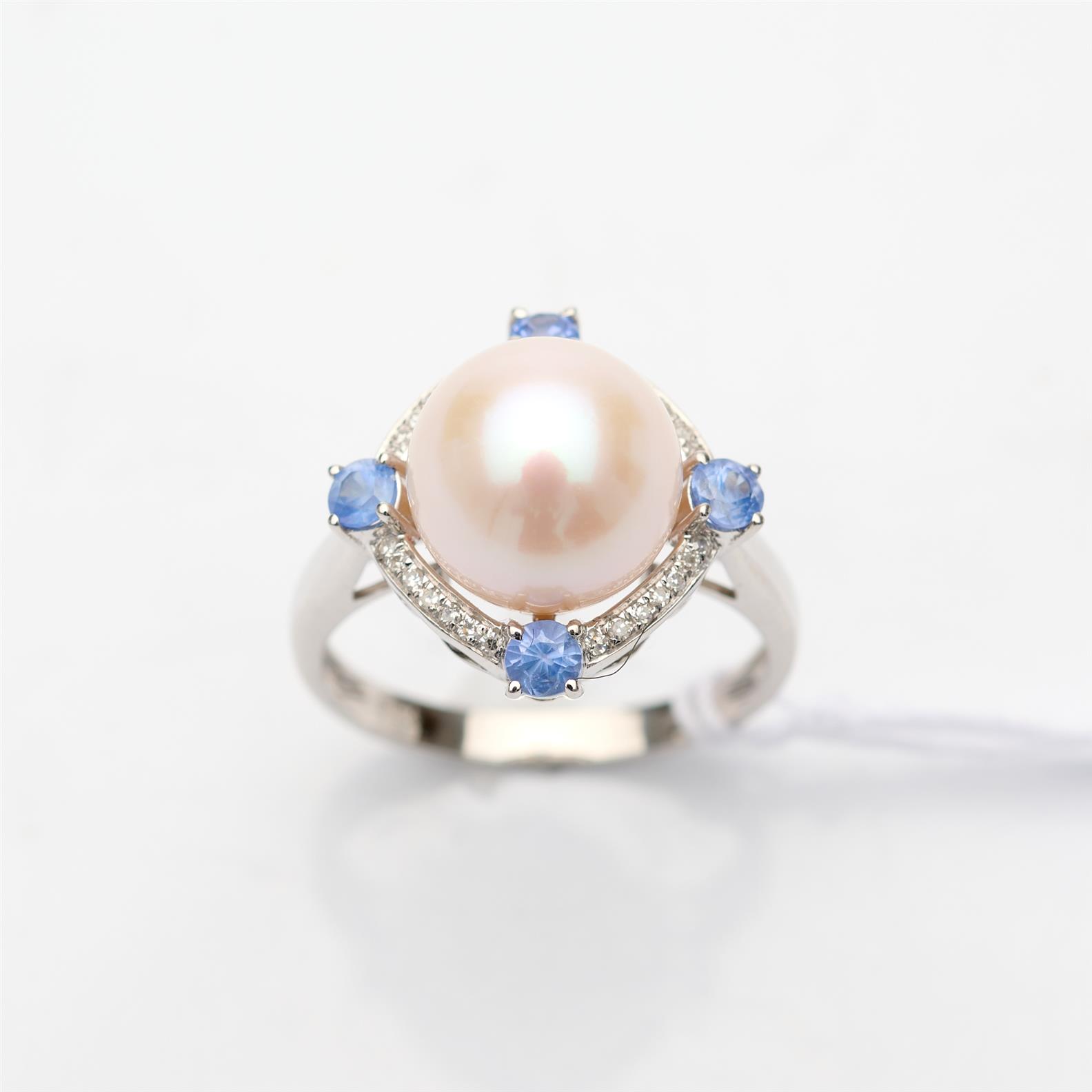 AN AKOYA, SAPPHIRE AND DIAMOND SET RING IN 18CT WHITE GOLD, THE PEARL MEASURING APPROXIMATELY 10.27MM IN DIAMETER, SIZE O, 4.65GMS
