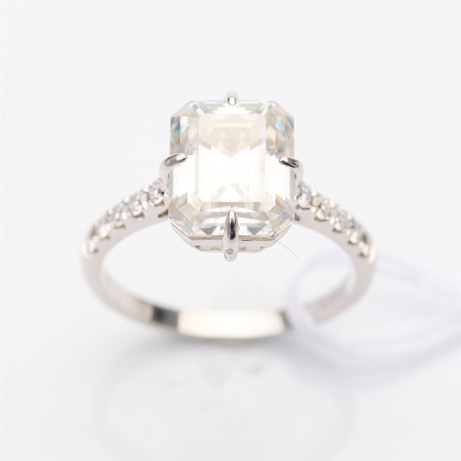 A MOISSANITE SET RING IN 18CT WHITE GOLD, THE CENTRING MOISSANITE WEIGHING 4CTS, RING SIZE N 1/2, 3.11GMS