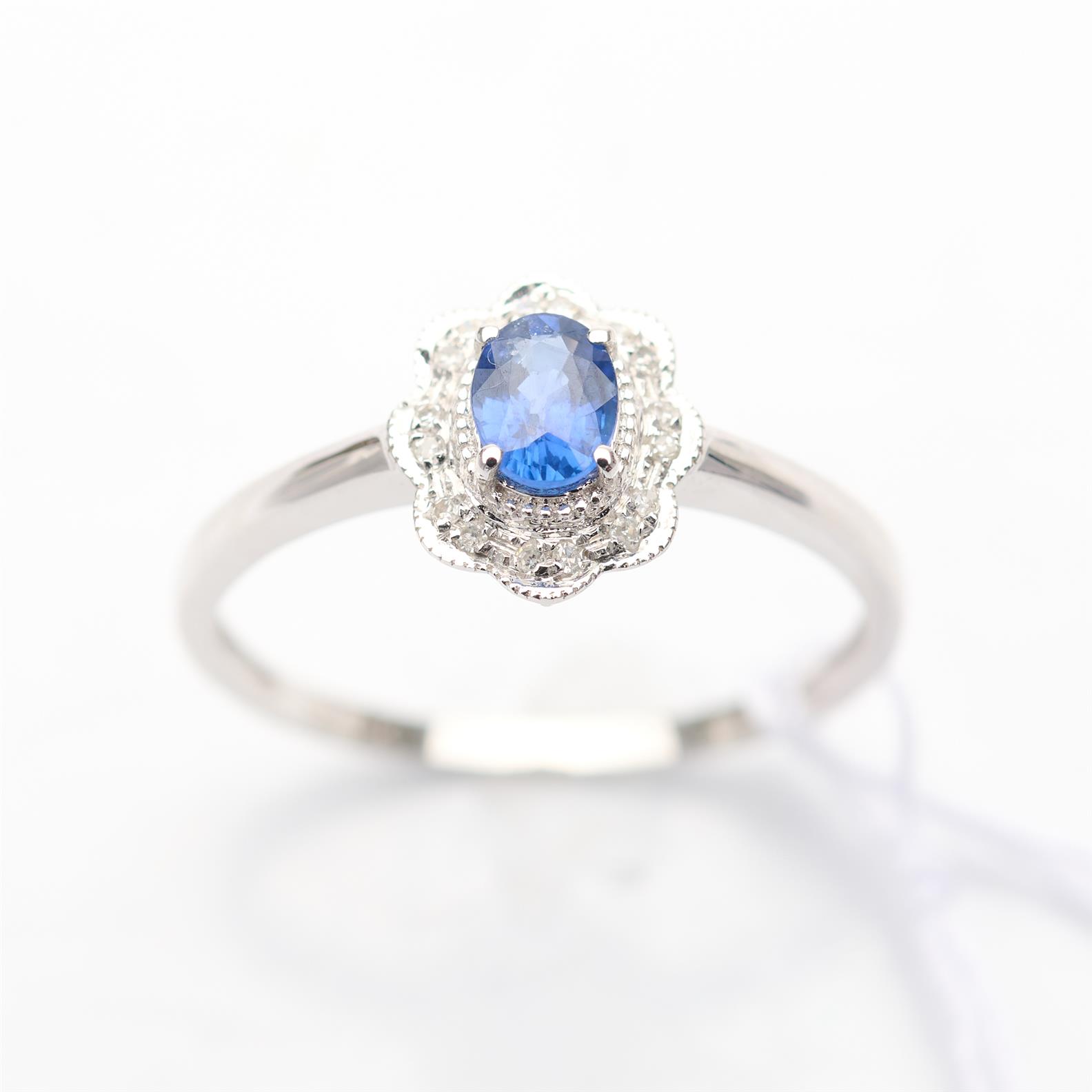 A SAPPHIRE AND DIAMOND SET RING IN 18CT WHITE GOLD, RING SIZE P, 1.41GMS