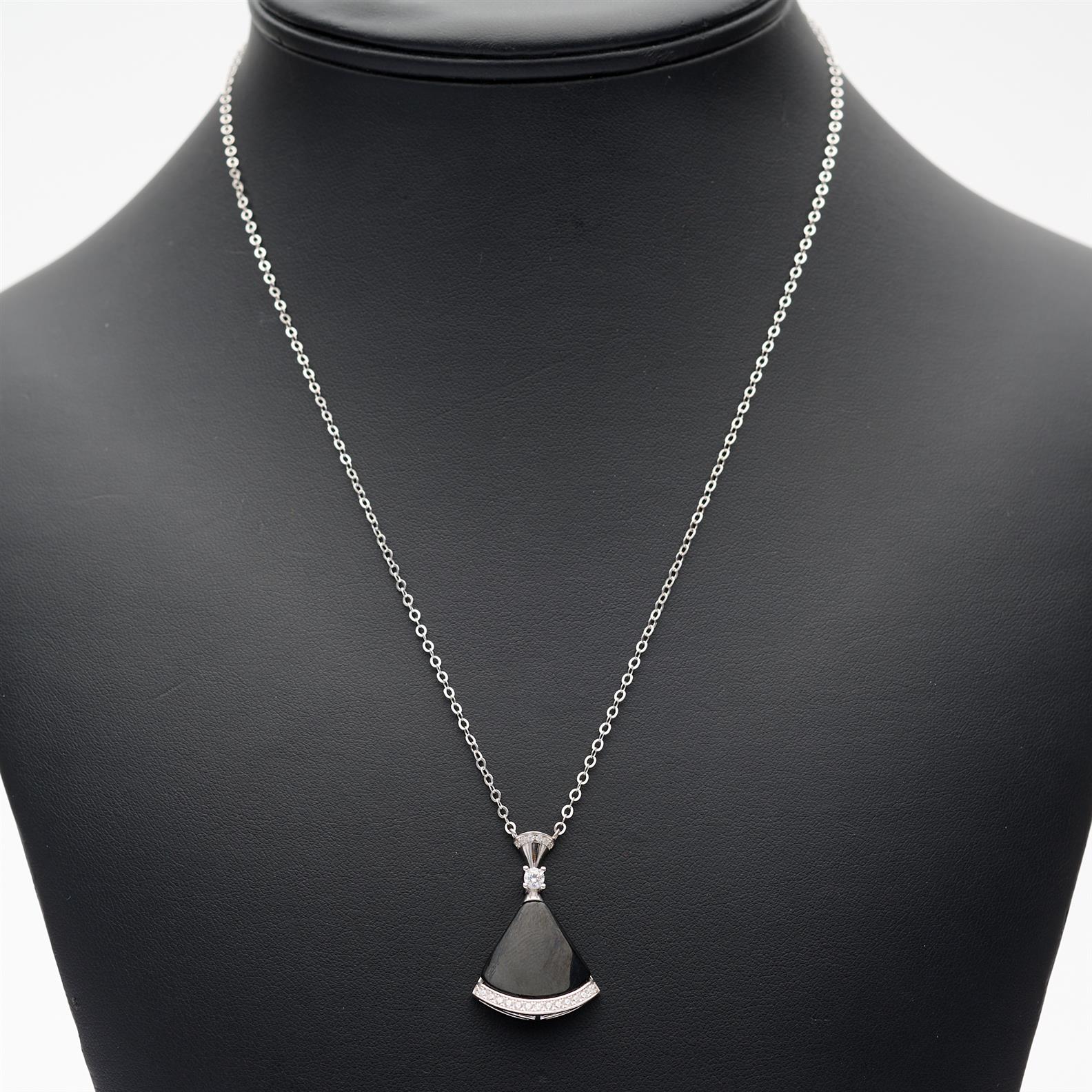 A ONYX AND CUBIC ZIRCONIA SET PENDANT IN STERLING SILVER, THE PENDANT APPROXIMATELY 16MM X 20MM, CHAIN LENGTH ADJUSTABLE FROM APPROXIMATELY 400MM TO 460MM