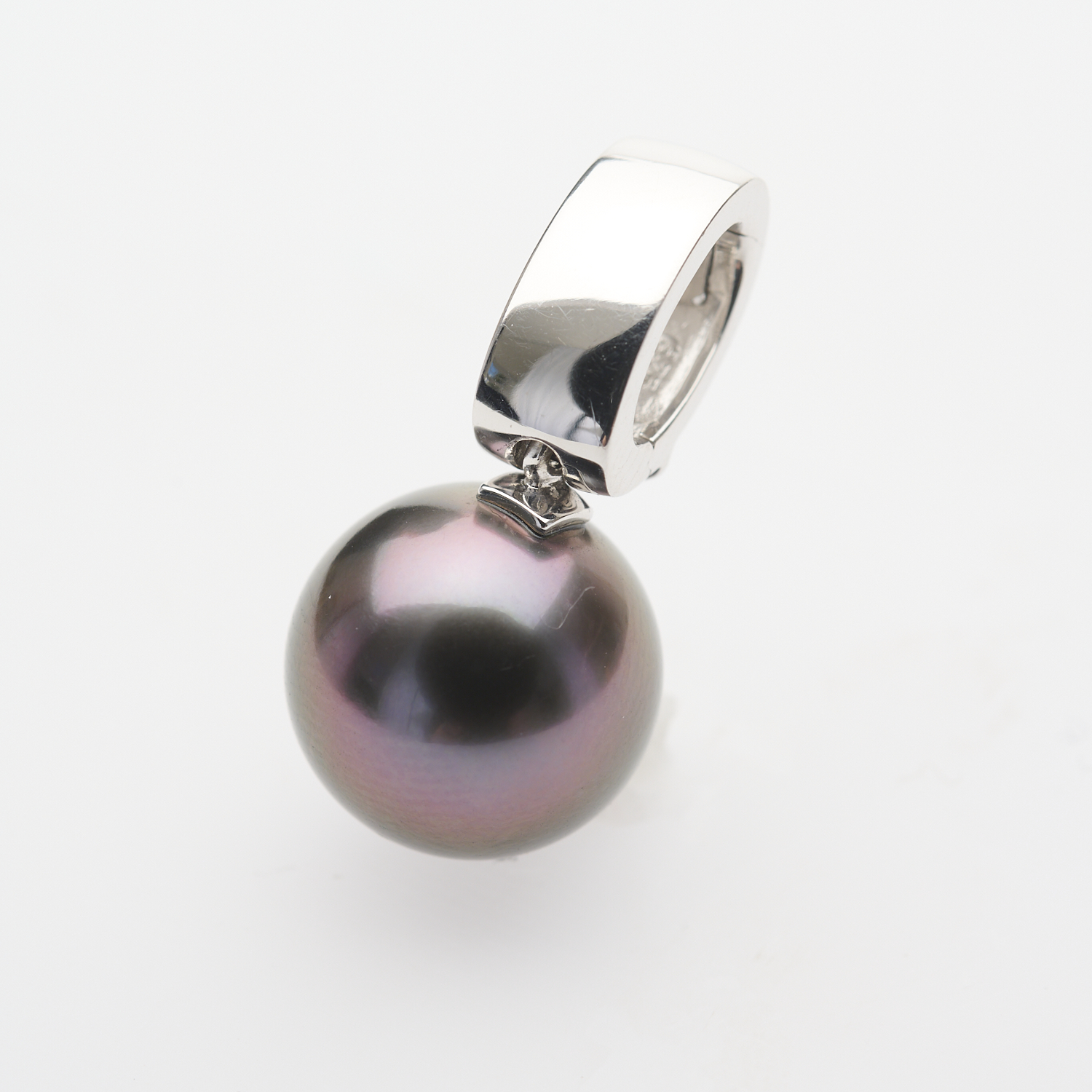 A TAHITIAN PEARL ENHANCER IN 9CT WHITE GOLD, THE PEARL IN AUBERGINE HUE MEASURING 12MM ROUND