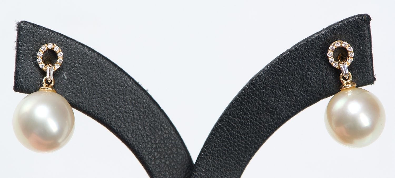 A PAIR OF SOUTH SEA PEARL AND DIAMOND EARRINGS TO POST AND BUTTERFLY FITTINGS IN 18CT GOLD, THE PEARLS MEASURING 10.5MM, THE DIAMONDS WEIGHING 0.06CTS
