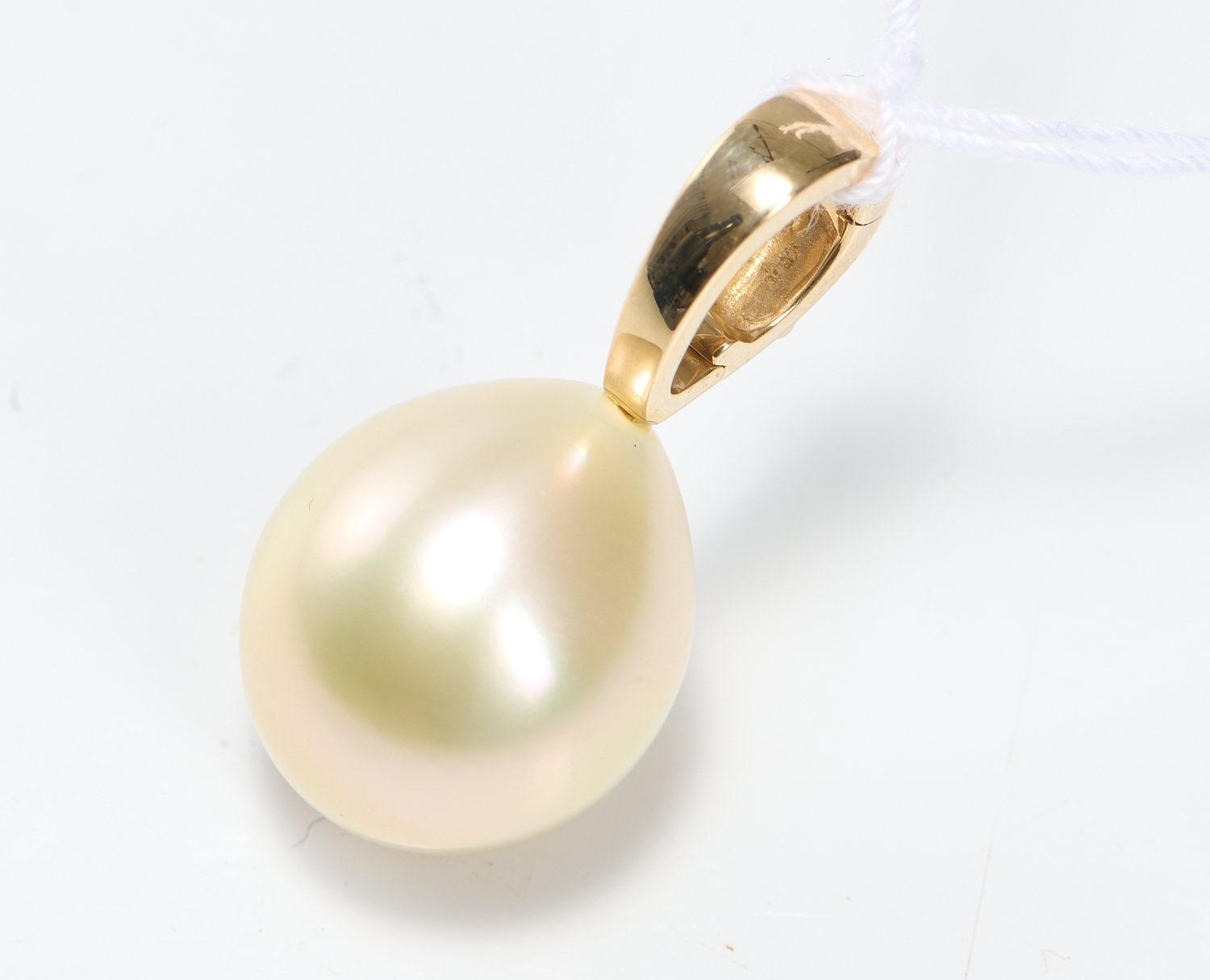A SOUTH SEA PEARL ENHANCER IN 9CT GOLD, THE PEARL MEASURING 13.5MM X 16MM