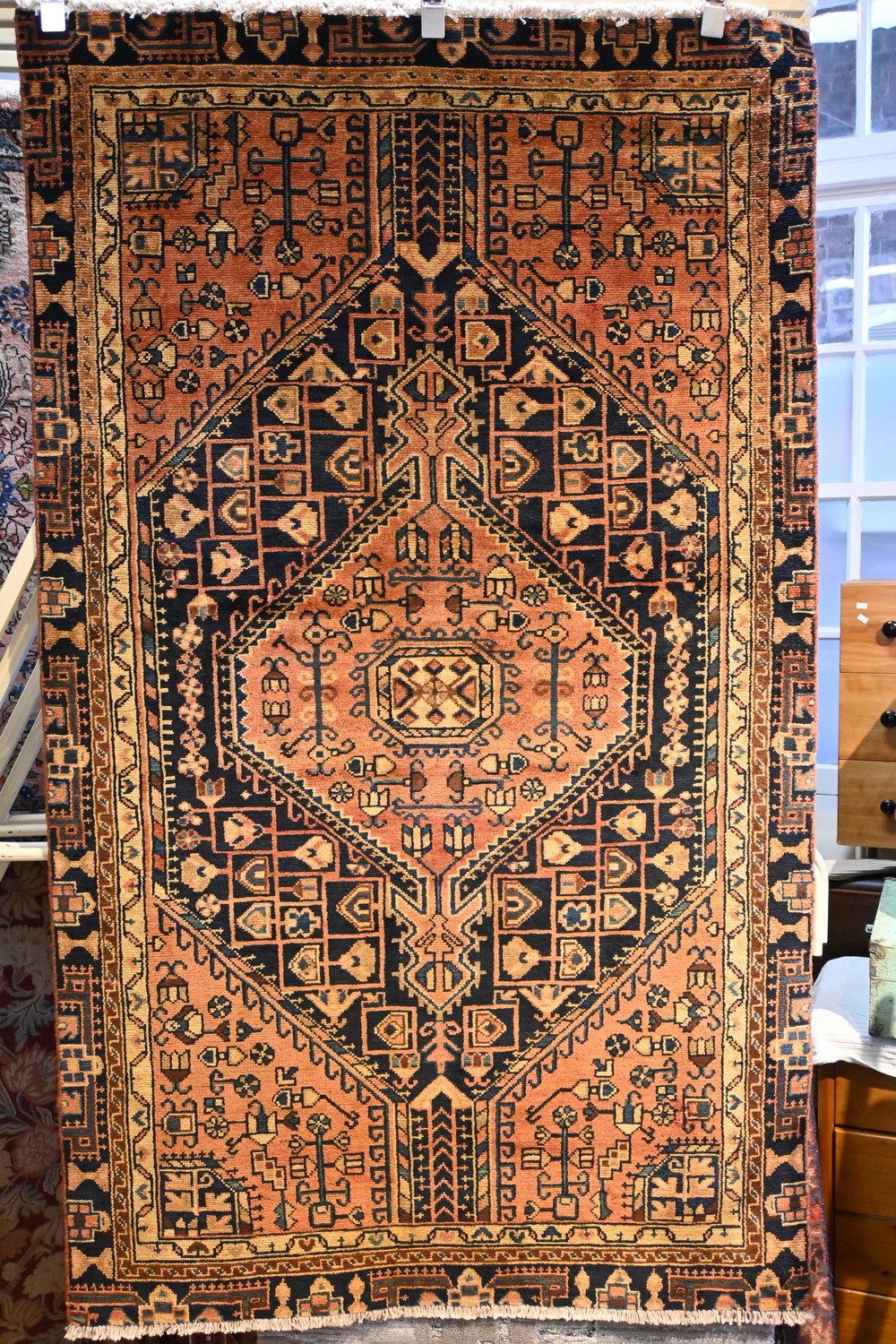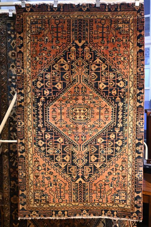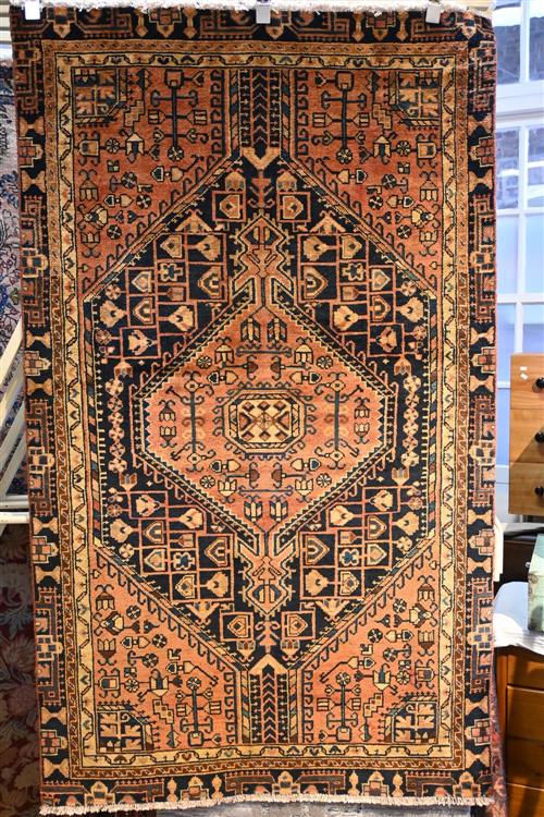 A TRIBAL PERSIAN TOYSERKAN RUG. 100% WOOL& NATURAL DYES. HAND-KNOTTED VILLAGE WEAVE WITH TRIBAL DESIGN OF BOLD HEXAGONAL ANCHORED MEDALLION & CORNER MEDALLIONS IN A CHARCOAL-TONED FIELD OF GEOMETRIC PATTERNS & LEAF FORMS. ALL OVER IN A SOFT RED FIELD OF TREE OF LIFE DESIGN AND GEOMETRIC DESIGNS. BORDER OF ROSETTES & TENDRILS DOCUMENTATION OF AUTHENTICITY INCLUDED ORIGIN: IRAN- RRP: $2,100.SIZE: 195X115CM