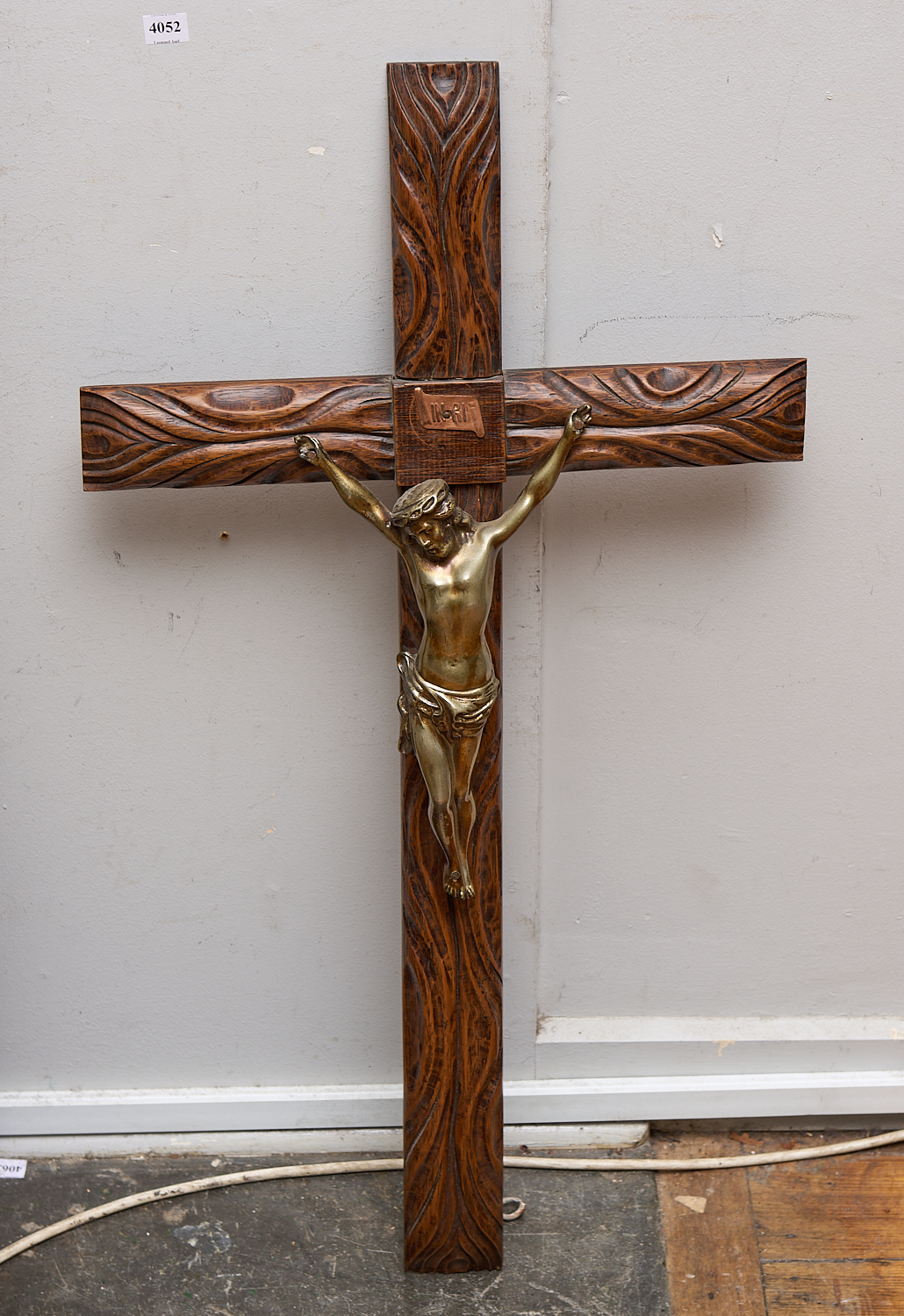 A FRENCH OAK CARVED CRUCIFIX WITH BRASS CORPUS FIGURE H.80CM, LEONARD JOEL LOCAL DELIVERY SIZE: MEDIUM
