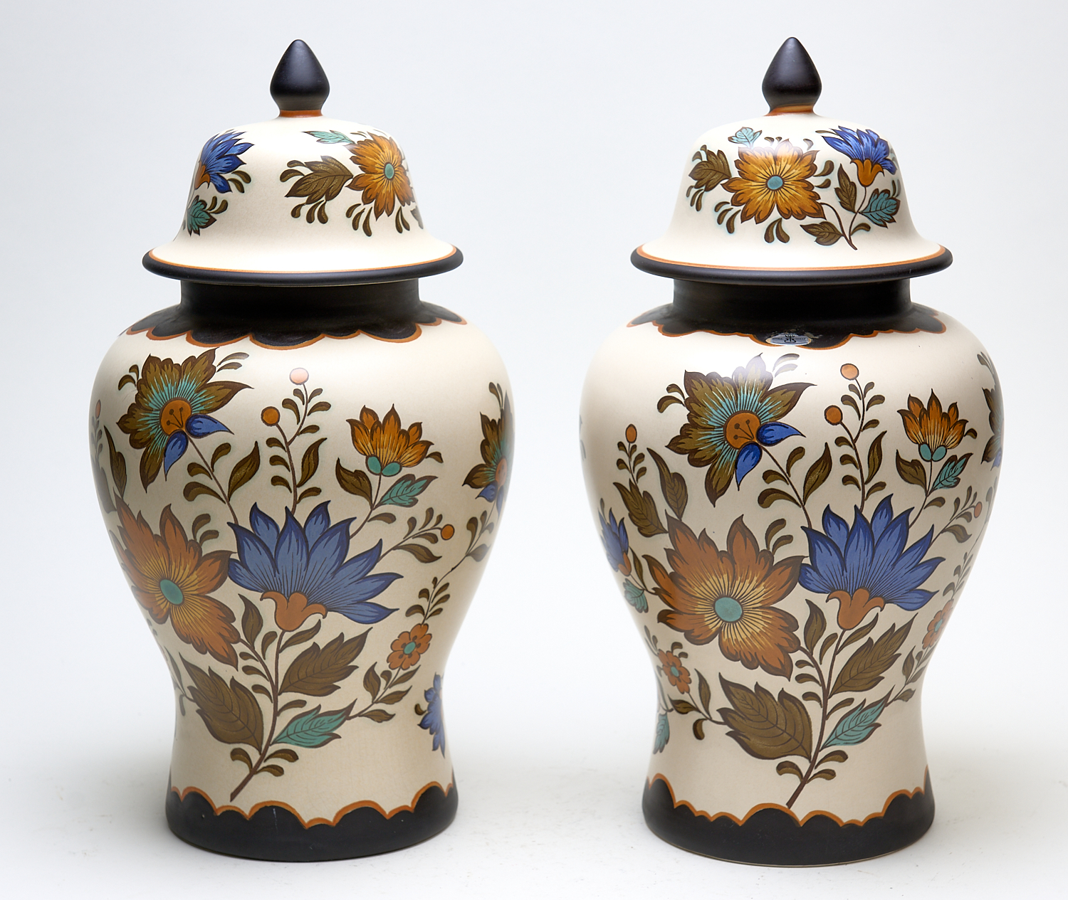 A PAIR OF DUTCH HOLLAND 'FLORA' GOUDA PLATEEL HANDWERK LIDDED URNS H.42CM, LEONARD JOEL LOCAL DELIVERY SIZE: MEDIUM