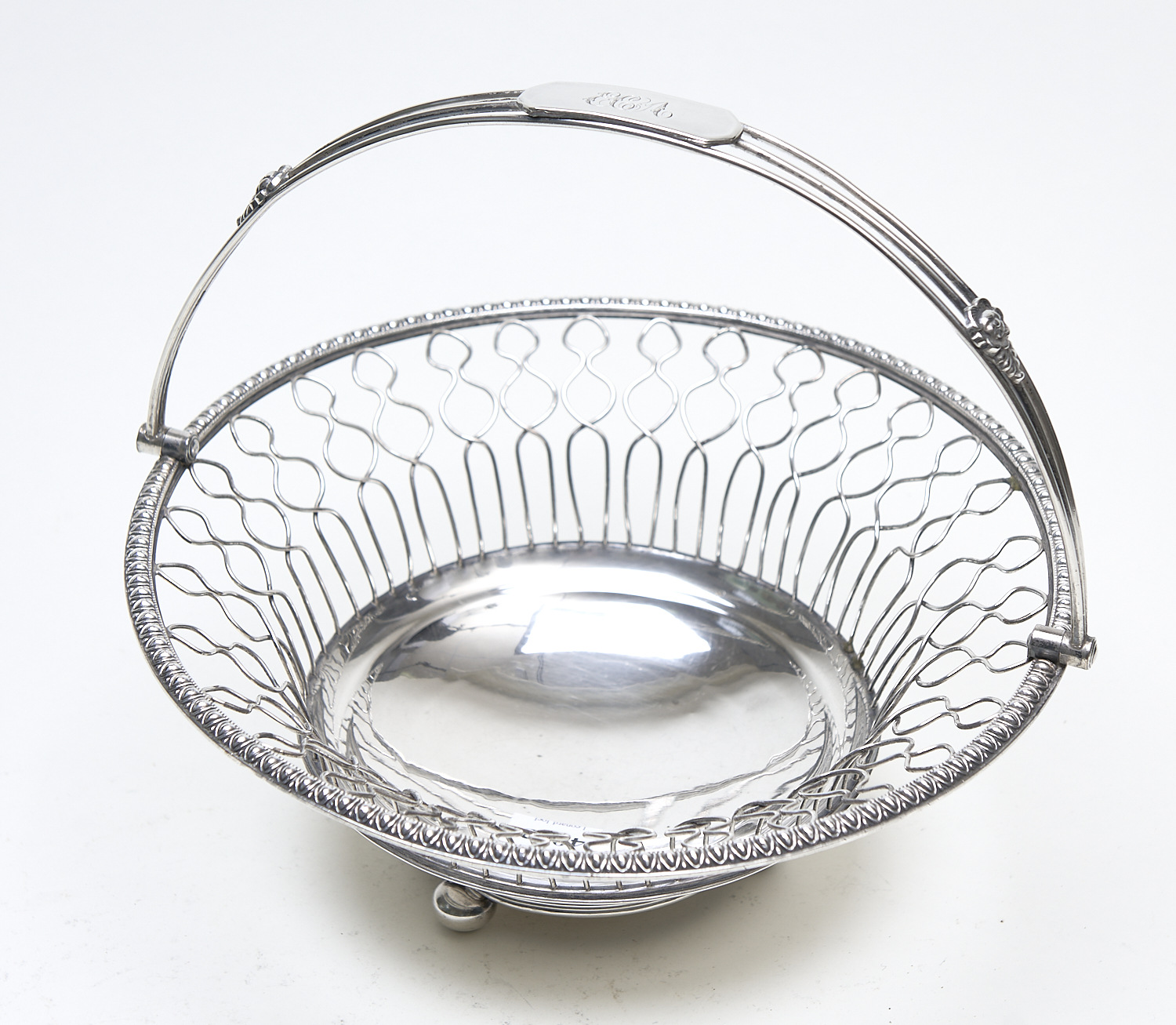 A SILVER PLATED WIRE FORM BREAD BASKET WITH SWING HANDLE DIA.25CM, LEONARD JOEL LOCAL DELIVERY SIZE: SMALL