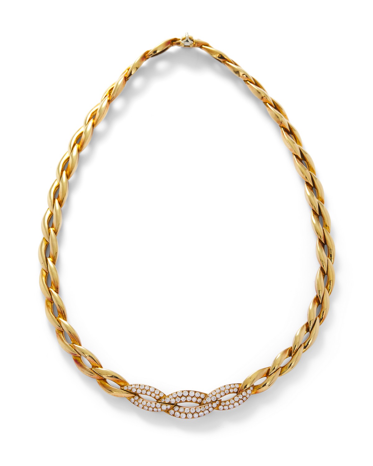 Modelled as a line of interlocking half round elliptical links decorated to the front with brilliant-cut diamonds, the diamonds together weighing approximately 2.00 carats, mounted in 18ct gold, inner circumference 380mm, signed VCA for Van Cleef & Arpels, numbered C4261 A1.