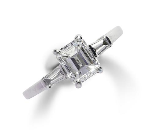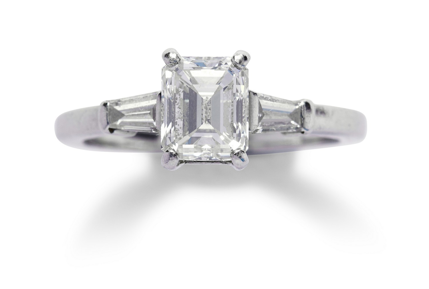The emerald-cut diamond weighing 1.50 carats, is claw-set between a pair of tapered baguette diamond shoulders, mounted in 18ct white gold, size M, signed Bulgari, numbered 55247, Italian registration and maker's marks.