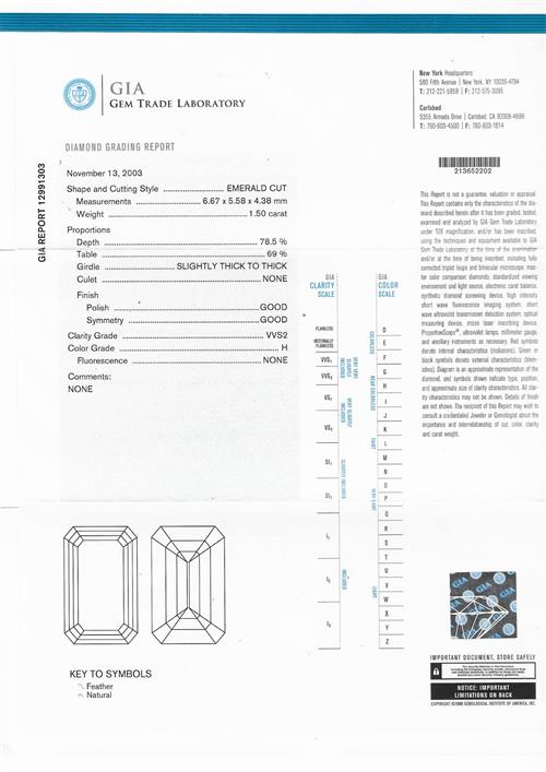 a GIA report numbered 12991303, dated 13 November 2003, stating that the 1.50 carat diamond is natural, VVS2 clarity, H colour;