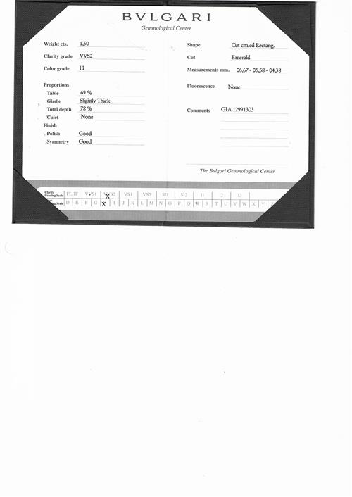 a Bulgari Gemmological Center report stating that the 1.50 carat diamond is natural, VVS2 clarity, H colour;