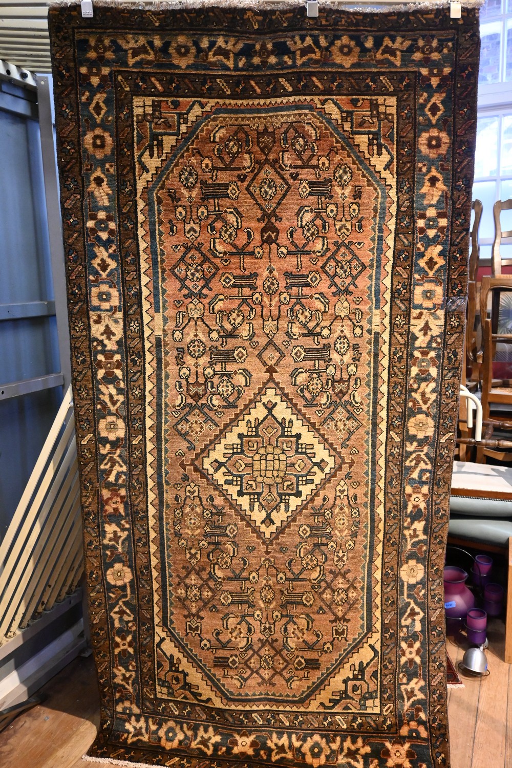 A PERSIAN HOSSAINABAD RUG. 100% WOOL PILE. HAND-KNOTTED VILLAGE WEAVE FROM THE HAMADAN REGION WITH TRADITIONAL DESIGN OF DIAMOND SHAPE MEDALLION IN A SOFT, RED-TONED FIELD OF HERATI MAHI PATTERNS. HERATI-PATTERNED BORDER IN TEAL TONE. SIZE: 260X130CM ORIGIN: PERSIA - RRP: $2,200 DOCUMENTATION OF AUTHENTICITY INCLUDED